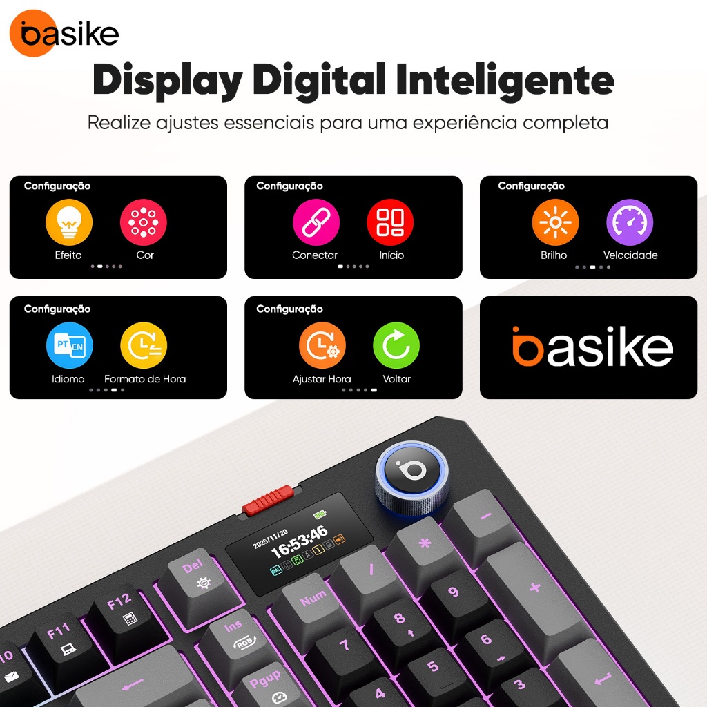 👑 Bem-vindo à loja oficial Basike. Todos os produtos na loja são produtos originais Basike 🔥 Siga esta loja para desfrutar de uma oportunidade de 5br de desconto 🚚Em rela ção à entrega, iremos entregar entre 12 horas após a colocação do pedido ✨Sua satisfa ção é a nossa prioridade e a avaliação de 5 estrelas é aparecida 💢Dever-se notar que quaisque problemas de produto exigem um vídeo de unboxing para ser apresentado ✅【Teclado Mecânico sem Fio 100% RGB para Gamers】Transforme sua experiência de jogo com o **Basike Teclado Mecânico Gamer**! Com design **100% completo** e **teclas mecânicas de eixo vermelho**, oferece resposta ultrarrápida e durabilidade. Perfeito para quem busca precisão e conforto durante horas de gameplay! ✅【Multifuncional com Tela e Botão de Controle】Destaque-se com o **exclusivo botão rotativo multifuncional** e **tela de status integrada**! Ajuste volume, iluminação RGB e modos de jogo com um simples toque. Personalize cada detalhe para dominar qualquer cenário! ✅【Três modos de conexão: com fio, Bluetooth e 2.4G】Este **teclado mecânico** oferece total liberdade com três opções de conexão; um modo **com fio** está disponível usando um cabo USB. Compatível com PCs, laptops e até mesmo celulares! Latência zero, desempenho superior! ✅【RGB Vibrante e Design Premium】 Iluminação **RGB personalizável** com 16 milhões de cores! Cada tecla brilha intensamente, criando um visual imersivo. Construção robusta e **teclas mecânicas duráveis** para resistir a maratonas de jogos! ✅【Teclado Gamer Mecânico para Todos】Seja você um **pro player** ou um entusiasta, o Basike é a escolha certa! Combina estilo, tecnologia e ergonomia. Garanta o seu **teclado mecânico 100%** agora e eleve seu setup! ✨Especificações Técnicas Switches mecânicos vermelhos Função anti-ghosting para múltiplas teclas Estrutura eletroforética avançada: ferro + ABS Cabo de dados Type-C destacável de alta qualidade, 1,8 metros Teclas duráveis: até 50 milhões de cliques Retroiluminação RGB com múltiplos efeitos e funções Pés antiderrapantes Teclas fabricadas com processo de moldagem por injeção dupla para maior durabilidade Formato padrão (100%): 99 teclas Dimensões: 406,81 mm (C) x 140,31 mm (L) x 43,23 mm (A) Peso: 1058 g ± 10 g Capacidade da bateria: 4000 mAh ✨Conteúdo da embalagem: 1 teclado mecânico para jogos 1 cabo USB Type-C trançado 1 receptor USB 1 manual do usuário #TecladoMecânico #TecladoGamer #RGB #Basike #JogosProfissionais