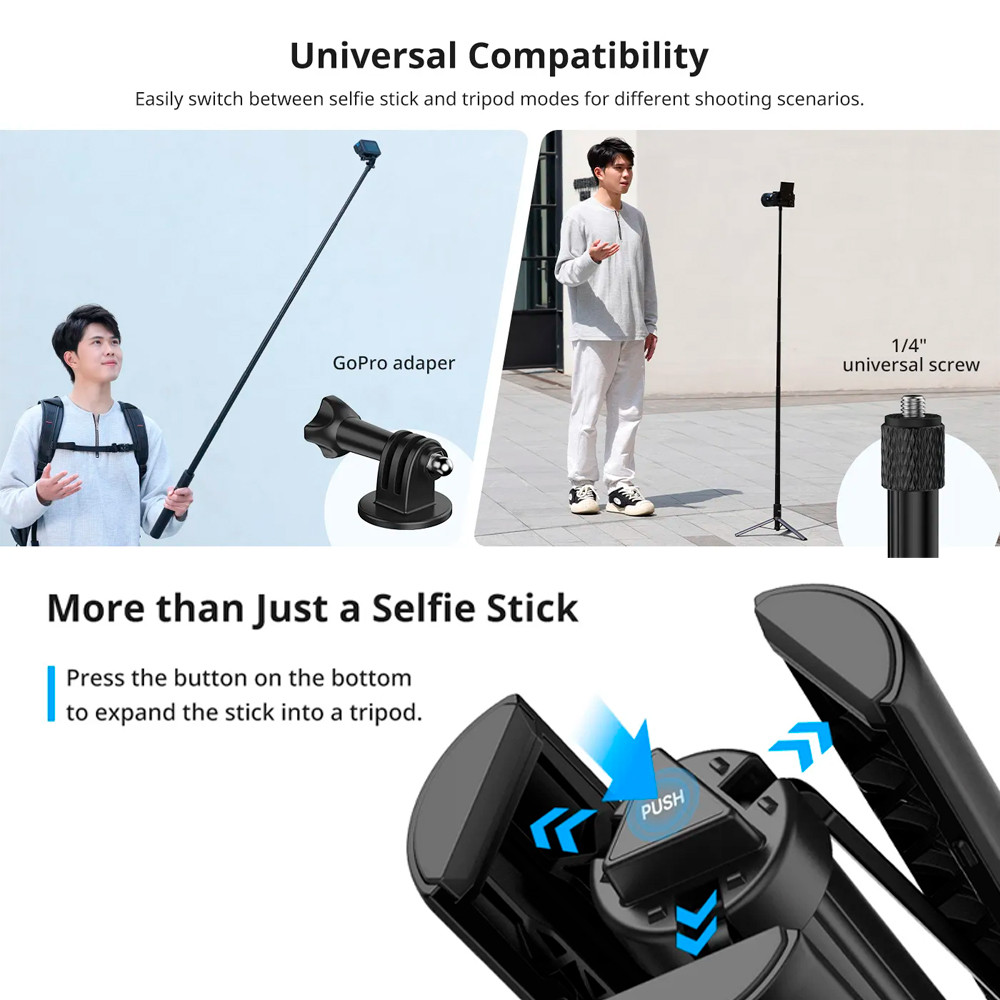 Bastão Extensor Tripé Ulanzi TT52 1.5m p/ Câmera de Ação, Compatibilidade Universal, Design Portátil, Leve e Versátil 1. Design 2 em 1: Bastão Extensor e Tripé O Ulanzi TT52 combina a funcionalidade de um bastão de selfie com um tripé estável, permitindo capturas dinâmicas e fixas. Ideal para vloggers, cineastas e criadores de conteúdo que buscam versatilidade em gravações. 2. Compatibilidade Universal para Diferentes Equipamentos Com rosca padrão de 1/4" e adaptador GoPro incluso, é compatível com câmeras de ação, smartphones e outros dispositivos. Um acessório essencial para qualquer tipo de produção audiovisual. 3. Extensão Ajustável de até 1,5m A estrutura telescópica permite ajustar a altura conforme a necessidade da gravação, garantindo ângulos variados e capturas mais amplas. Ideal para selfies, fotos em grupo e vídeos profissionais. 4. Construção Leve e Portátil Feito com materiais resistentes e leves, o Ulanzi TT52 é fácil de transportar e manusear, perfeito para viagens, gravações externas e aventuras ao ar livre sem comprometer a estabilidade. 5. Praticidade e Facilidade de Uso Basta desdobrá-lo para transformar o bastão em tripé ou ajustar a altura conforme necessário. Um equipamento intuitivo e eficiente para capturar momentos com qualidade e estilo. Garantia de 90 dias.