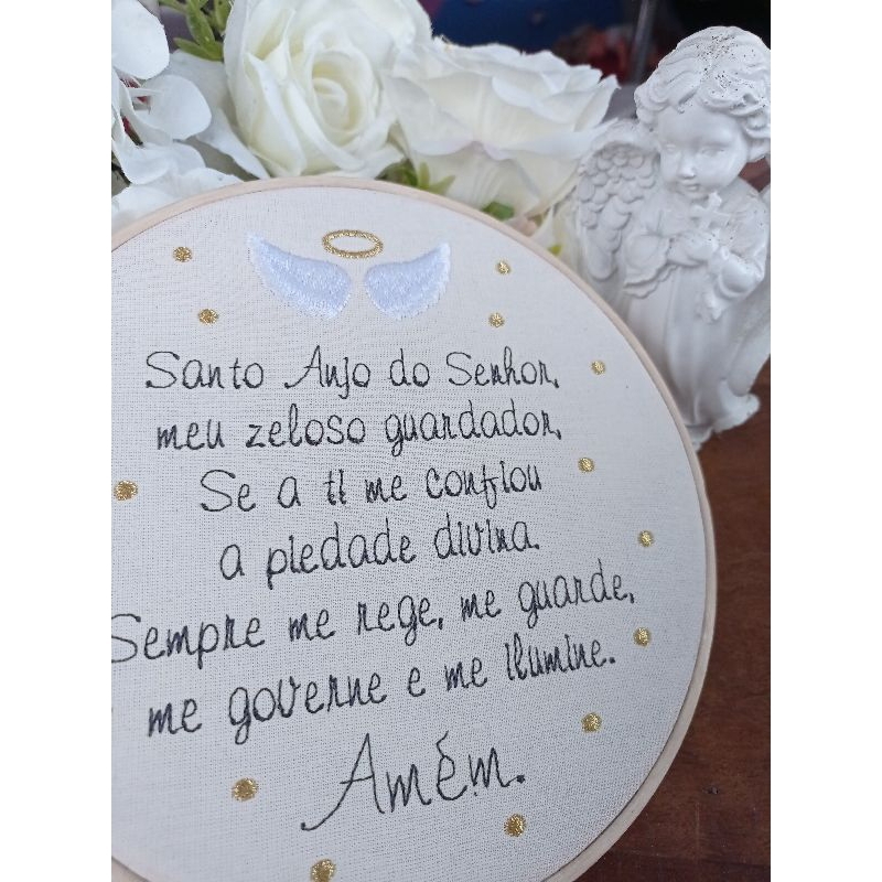 Bastidor Santo Anjo com Oração Bordado Computadorizado | Porta Maternidade Bastidor delicado com a oração do Santo Anjo, bordado em máquina computadorizada com acabamento de alta qualidade. Uma peça única que transmite fé, proteção e carinho, ideal tanto para decoração quanto para presentear. 💝 Usos indicados: ✔️ Porta maternidade personalizado com o nome do bebê ✔️ Quarto infantil, trazendo a proteção do Anjo da Guarda ✔️ Presente especial de batizado, nascimento ou aniversário ✔️ Decoração religiosa e devocional 📏 Tamanho: 20 cm 🎨 Personalização: nomes, cores e detalhes podem ser ajustados conforme seu pedido (informar via chat). 🌿 Materiais: Bastidor de bambu e tecido algodão cru.