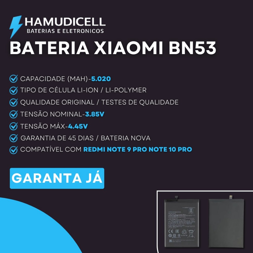 # 🔋 **Bateria Compatível Xiaomi Redmi Note 9 Pro / Note 10 Pro / Note 10 Pro Max (BN53)** ✅ Produto **novo**, testado e com **nota fiscal** ✅ Envio rápido e embalagem segura ✅ Restaure a autonomia e o desempenho original do seu Xiaomi --- ## 📌 **Especificações Técnicas** * Modelo: **BN53** * Tipo: **Íon de Lítio (Li-ion)** * Voltagem: **3,87V** * Capacidade: **aprox. 5020 mAh** * Compatibilidade: **Xiaomi Redmi Note 9 Pro / Note 10 Pro / Note 10 Pro Max** * Garantia: **45 dias** --- ## 💡 **Vantagens da Bateria BN53** ⚡ Alto desempenho e excelente autonomia 🔒 Proteção contra sobrecarga, superaquecimento e curto-circuito 👌 Substitui a bateria original sem adaptações --- ## 🔧 **Dicas de Uso** * Faça uma carga completa antes do **primeiro uso** * Utilize **carregadores originais Xiaomi** para maior durabilidade * Confira o modelo do seu celular antes da compra --- 📦 **Entrega rápida, direta e segura** 💯 **Qualidade garantida + Nota Fiscal** ---