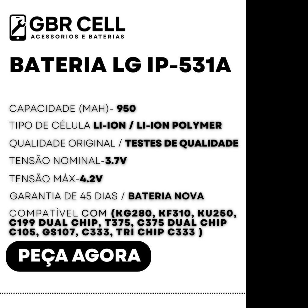 ### 🔋 **Descrição do Produto:** ✅ **Produto novo, testado e com Nota Fiscal** ✅ **Compatível com diversos modelos LG** ✅ **Entrega rápida e direta do Brasil** --- ### ⚙️ **Especificações Técnicas:** * Modelo: **IP-531A** * Tipo: **Íon de Lítio (Li-ion)** * Voltagem: **3,7V** * Capacidade: **aprox. 900 mAh** * Compatibilidade: 📱 **LG GM205 / A175 / A210 / A275 / C105 / B220 / G360** * Garantia: **45 dias** --- ### 💡 **Vantagens:** * 🔋 **Recupere a autonomia e o desempenho original do seu celular** * ⚡ **Proteção contra sobrecarga, curto-circuito e superaquecimento** * 🔧 **Instalação simples e encaixe perfeito** --- ### 📦 **Conteúdo da Embalagem:** * 1x **Bateria IP-531A compatível LG** --- 📦 **Entrega direta, rápida e segura** 💯 **Qualidade garantida + Nota Fiscal**