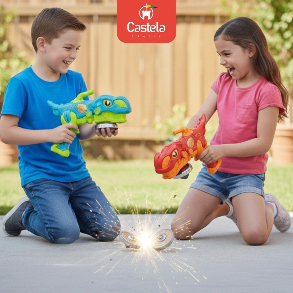 DESCRIÇÃO DO PRODUTO: Prepare-se para duelos eletrizantes com o kit completo de Piões da Castela! O conjunto acompanha 4 piões super resistentes e 2 pistolas de dinossauro lançadoras (verde e vermelho) que garantem disputas emocionantes entre amigos. Destaque especial: os piões brilham intensamente conforme giram mais rápido, deixando a batalha ainda mais divertida e cheia de efeitos incríveis! -4 piões de alta performance -2 pistolas de dinossauro lançadoras (verde e vermelho) -Efeito de luz nos piões ao rodar CARACTERÍSTICAS TÉCNICAS: Conteúdo da Embalagem: 2 Pistolas, 4 Piões Dimensões Aproximadas da Embalagem: 9 cm x 31 cm x 50 cm (Altura x Largura x Comprimento/Profundidade). Material/Composição: Metal/Plástico Idade Mínima Recomendada: A partir de 3 anos Participantes: A partir de 1 pessoa Alimentação: Não se aplica Marca: Castela Referência: CBS0743 Outras informações: As cores podem variar entre as imagens mostradas acima e o produto. Imagens meramente ilustrativas. Aviso: As informações e imagens divulgadas são de total responsabilidade do fabricante/fornecedor. Produto lacrado e disponível a pronta entrega para todo Brasil! APROVADO PELO INMETRO