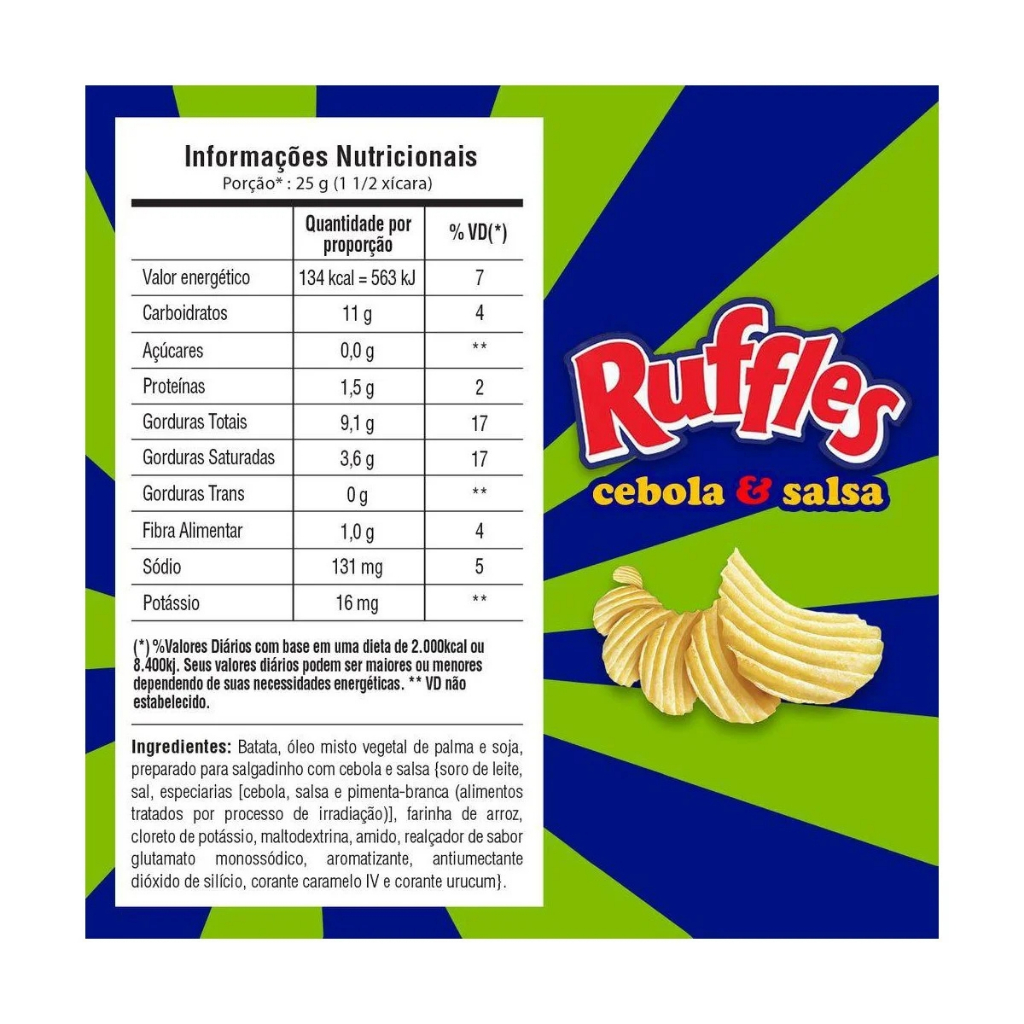 Descubra o sabor surpreendente das Batatas Fritas Onduladas Ruffles Cebola & Salsa! Com 115g de crocância irresistível, essas batatas são perfeitas para quem aprecia um lanche cheio de personalidade. Pacote ideal para levar a qualquer lugar, perfeito para compartilhar ou saborear sozinho. Ingredientes: Batata, óleo composto de milho, canola, girassol, soro de leite, sal, cebola-salsa, pimenta-branca. ALÉRGICOS: CONTÉM DERIVADOS DE SOJA DE LEITE. CONTÉM LACTOSE. CONTÉM GLÚTEN Somos uma loja especializada em artigos de festa, confeitaria, embalagens e atacado em doces com lojas físicas no estado de São Paulo, desde 2002. Imagens meramente ilustrativas, de acordo com nossos fornecedores que nos fornecem. Todas as Informações divulgadas são de responsabilidade do fabricante/fornecedor.