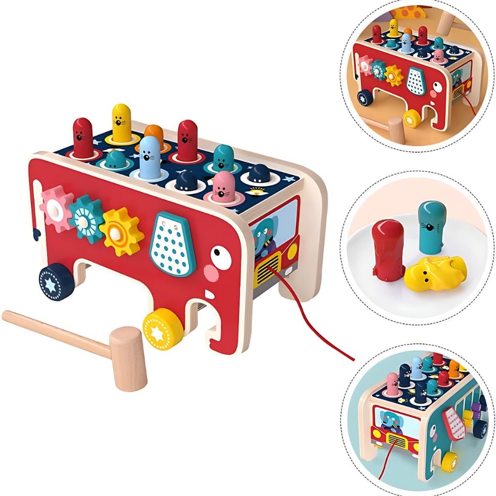 Bate Martelo Elefante MDF Caminhão Elefante Cordinha Educativo Sensorial Montessori Toymix