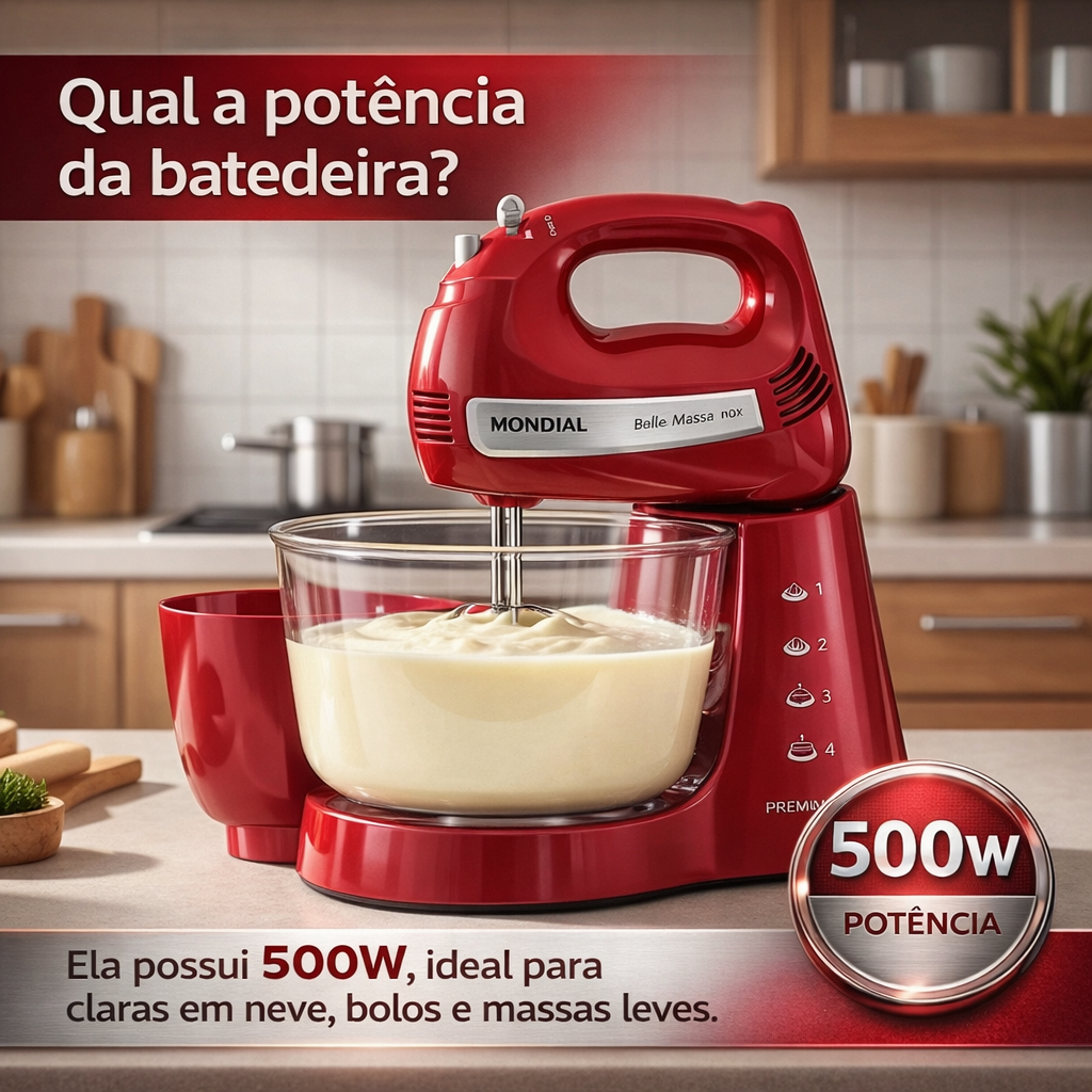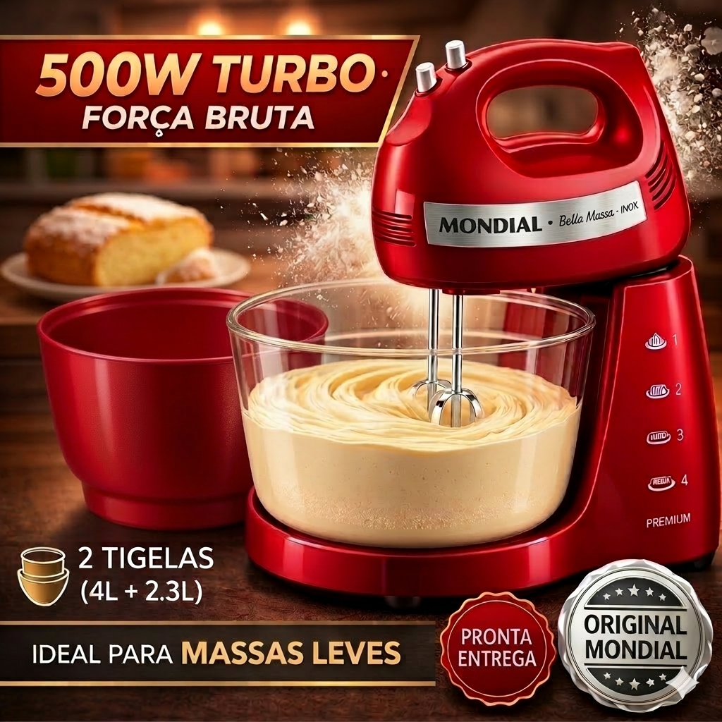 Batedeira Mondial Bella Massa 500W Turbo Inox B-29 NP: Potência e Versatilidade para sua Cozinha A Batedeira Mondial Bella Massa B-29 NP é a ferramenta essencial para quem busca eficiência e praticidade no preparo de receitas. Com 500W de potência e design robusto em inox, esta batedeira de base oferece a força necessária para misturar massas leves. Equipada com duas tigelas de diferentes capacidades, ela otimiza seu tempo na cozinha, permitindo múltiplos preparos sem interrupções. Transforme sua rotina culinária com a qualidade e performance que só a Mondial oferece. Especificações Técnicas Detalhadas Marca: Mondial Modelo: Bella Massa B-29 NP Tipo: Batedeira de Base (Não Planetária) Potência: 500W Velocidades: 4 Velocidades + Função Turbo Tigelas: 1x 4 Litros (Transparente) | 1x 2,3 Litros Material das Tigelas: Plástico resistente Batedores: Aço cromado (para massas leves) Base: Com roldanas (giro suave) Voltagem: 110V (verifique a compatibilidade elétrica) Cor: Vermelho / Inox Diferenciais que Elevam suas Receitas • 500W de Potência Turbo Garante força e desempenho excepcionais para misturar claras em neve até massas de bolo. A função Turbo acelera o processo, otimizando seu tempo. • Duas Tigelas Inclusas (4L e 2,3L) Prepare diferentes receitas simultaneamente ou em grandes quantidades. A tigela de 4 litros transparente permite acompanhar o preparo com clareza. • Batedores em Aço Cromado Projetados para máxima durabilidade e eficiência, alcançam todas as áreas da tigela e garantem misturas homogêneas. • 4 Velocidades + Função Turbo Controle total sobre a textura e consistência das receitas, adaptando-se a cada tipo de preparo. • Design Inox Premium Acabamento moderno e elegante que valoriza sua cozinha, além de ser resistente e fácil de limpar. • Sistema de Fixação Exclusivo + Botão Ejetor Montagem e desmontagem simples, permitindo limpeza rápida e prática. Conteúdo da Embalagem • 01 Batedeira Mondial Bella Massa B-29 NP • 01 Tigela de 4 Litros (Transparente) • 01 Tigela de 2,3 Litros • 01 Par de Batedores em Aço Cromado • 01 Espátula • 01 Copo medidor • 01 Manual de Instruções Informações Essenciais para sua Compra • Produto Original Mondial Qualidade e confiabilidade de uma marca reconhecida no mercado de eletrodomésticos. • Pronta Entrega Envio imediato para você receber sua batedeira o mais rápido possível. • Garantia 30 dias de garantia. Não perca tempo! Adquira agora a Batedeira Mondial Bella Massa B-29 NP e eleve o nível das suas criações culinárias com potência, versatilidade e design. Clique em Comprar Agora!