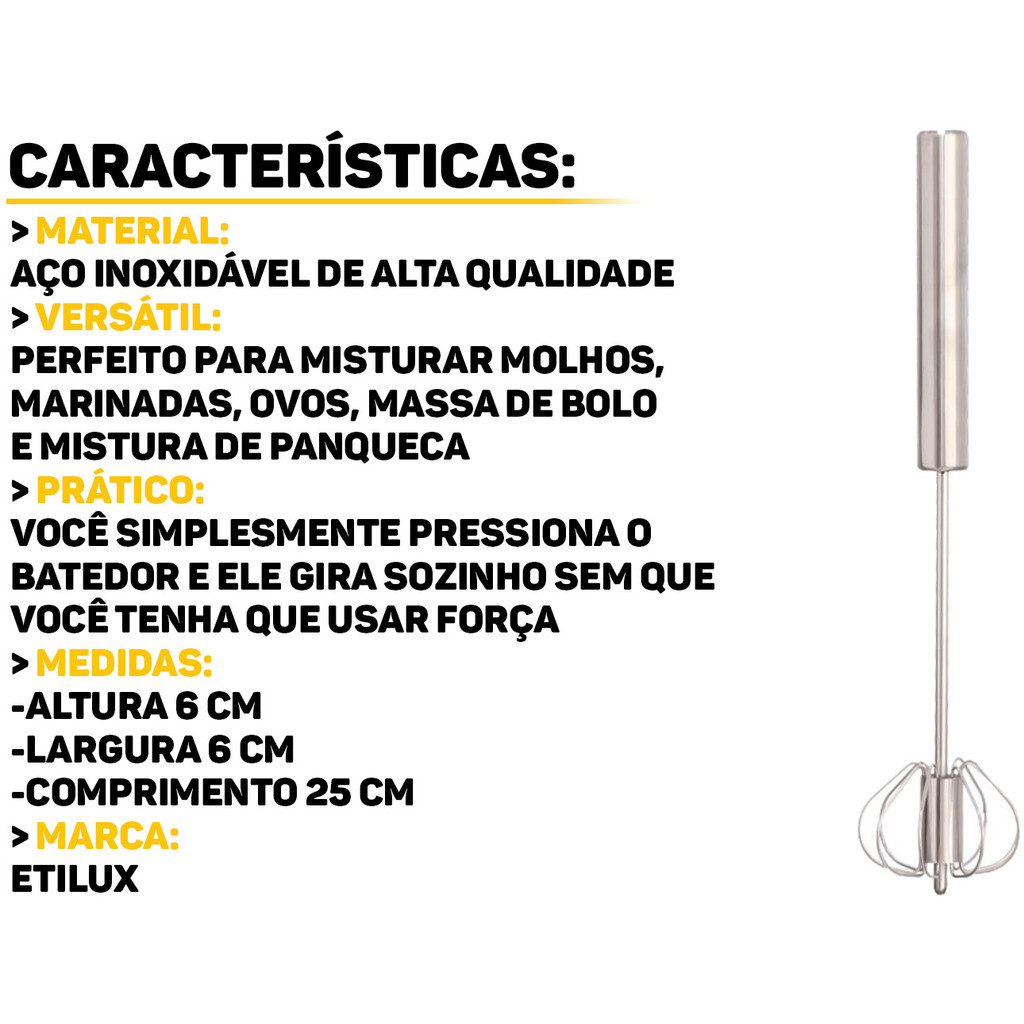 Batedor De Ovos Emulsão Western O Batedor De Ovos é ideal para quem busca agilidade na hora de bater ovos, preparar cremes, emulsões e misturas mais leves. Possui design funcional e eficiente, garantindo que suas receitas fiquem com a textura e consistência perfeitas. Características: > Ideal para emulsões; > Leve e fácil de manusear; > Produzido em aço inoxidável; > Formato ergonômico e prático; > Design elegante na cor prateada. Especificações Técnicas: > Material: aço inoxidável; > Dimensões do produto (C x L x A): 25cm x 6cm x 6cm. - Marca: Western - Garantia: 90 dias contra defeitos de fabricação Vantagens de comprar na Brester: - Produto a pronta entrega. - Produto novo, com garantia de fábrica. - Nota fiscal para Pessoa Física e Pessoa Jurídica.