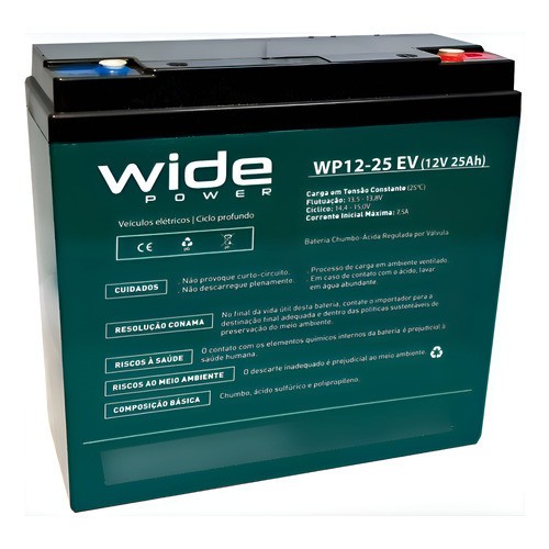 BATERIA SELADA 12V 25Ah - CICLO PROFUNDO A nova Bateria 12V 25Ah chegou para substituir a versão de 20Ah, oferecendo 25% a mais de autonomia, potência e durabilidade para o seu veículo elétrico. CONTÉUDO DA EMBALAGEM - 1 Bateria Wide 12v25ah COMPATIVEL A 12V 18AH / 12V 20AH / 12V 25AH / 12V 27AH / 12V 28AH- 6DZM20 / 6DZM18 ESPECIFICAÇÕES TÉCNICAS Tensão: 12 Volts Capacidade: 25 Amperes Peso: 4,70 Kg (unidade) Dimensões: Comprimento 9 cm / Largura 19 cm / Altura 18,5 cm PRINCIPAIS APLICAÇÕES: UPS/No-breaks - Iluminação de Emergência - Telecomunicações - Energia Solar - Energia Eólica - Bicicletas Elétricas - Motos elétricas - Carros Elétricos - Carros de Golf - Brinquedos Elétricos - Scooter. As bat seladas da operação Deep Cycle, são especialmente desenvolvidas para o mercado de veículos elétricos, propiciando maior autonomia, maior rendimento e elevada vida útil nestas aplicações. Com dimensões compactas e construção diferenciada, toleram altas correntes em regime de carga e descarga, sendo ideais para utilização em bicicletas elétricas, motos elétricas, carros elétricos, scooters elétricas, patinetes, entre outros. DIFERENCIAIS: - Suportam elevadíssimas correntes em regime de descarga, ideais para uso em veículos elétricos; - Válvula de segurança anti-explosão (One Way Valve) para controle do excesso de pressão interna; - Tecnologia AGM (Absorbed Glass Mat) propiciando alta eficiência (99%) no processo de recombinação dos gases; - Possuem baixíssima taxa de auto descarga, permitindo o armazenamento e es-tocagem por período superior ao das baterias convencionais; - Bat extremamente compactas, desenvolvidas no padrão internacional para veículos elétricos; - Terminais de conexão especiais para altas correntes. VANTAGENS: - Maior confiabilidade e rendimento nas aplicações de ciclo profundo (DEEP CYCLE); - Especialmente desenvolvidas para o mercado de veículos elétricos; - Longa vida útil em serviço contínuo, possibilitando inúmeros ciclos de carga e des-carga; - Permitem utilização em locais confinados, pois a liberação de gases é desprezível; - Reguladas por válvula (VRLA) com estrutura selada e perfeita vedação externa; - Totalmente livres de manutenção ou vazamentos, podendo ser instaladas em di-versas posições.