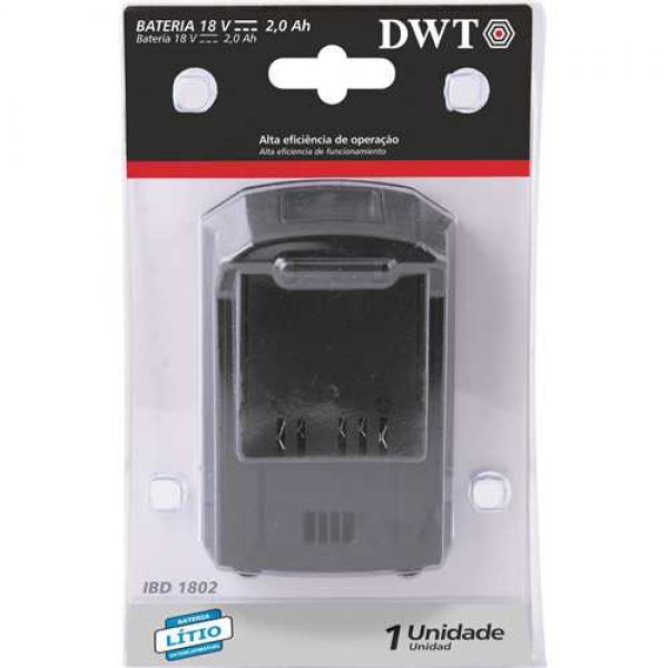 Indicada para a linha de ferramentas a bateria intercambiavel DWT. Carregadores indicados: carregador de bateria 18 V ICBD 1805 (6014180500) ou carregador de bateria carga rapida 18 V ICBD 1806 (6014180600). Bateria de ions de litio, garantindo alta eficiencia de operacao. Possui indicador de nivel de carga. Os tres LEDs vermelhos indicam o status de carga da bateria. Um LED aceso: indica baixa carga; dois LEDs acesos: metade da carga; e tres LEDs acesos: bateria carregada. Possui entrada de ar para sistema de refrigeracao e base emborrachada que ajuda a prevenir riscos em superficies e absorver impactos leves. Conteudo da Embalagem: 1 Bateria. Detalhes Tecnicos: - Modelo: IBD1802 - Tipo de bateria: Ions de litio - Tensão (V): 18,0 V - Capacidade da bateria (A): 2,0 Ah - Indicador de bateria fraca: Sim - Massa aproximada (peso): 0,428 kg
