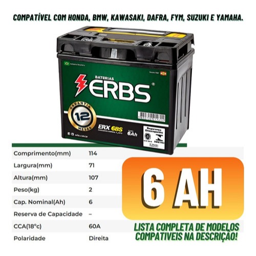 BATERIA - (6 AH - ERX 6BS) COMPATÍVEL: - HONDA TITAN 125-150-160 - HONDA FAN 125-150-160 - HONDA START 125-150-160 - HONDA CARGO 125-150-160 - HONDA BROS 150-160 - HONDA BIZ 125 - HONDA PCX 150 - YAMAHA FAZER 150 - YAMAHA CROSSER 150 MEDIDAS: - LARGURA: 7,1 cm - COMPRIMENTO: 11,4 cm - ALTURA: 10,7 cm MARCA: - ERBS ************** GARANTIA DE 12 MESES **************