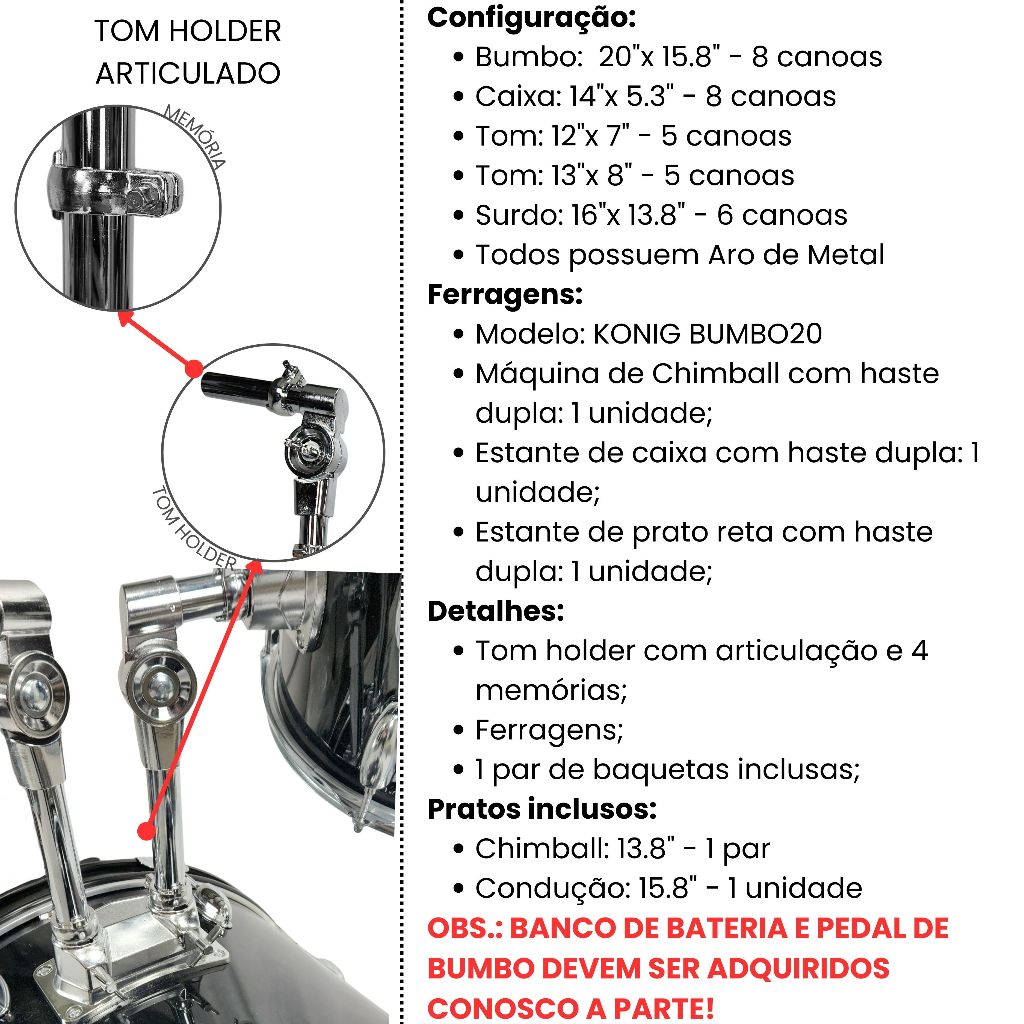 Bateria Acústica Musical 20 Polegadas Profissional Konig