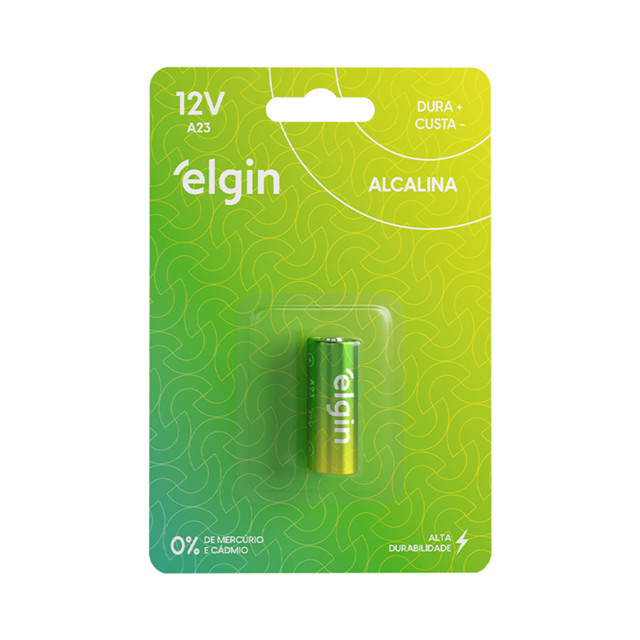 As baterias alcalinas A23 Elgin são usadas para controle de portão, calculadoras, relógios, brinquedos, timers, eletrônicos, lanternas e outros dispositivos. As Pilhas e Baterias Elgin são testadas periodicamente por laboratórios credenciados pelo INMETRO, para garantir a qualidade e conformidade com a resolução Conama 401. As Baterias Elgin não agridem o meio ambiente porque têm 0% de metais pesados em sua composição. Cartela com 1 bateria alcalina A23 12V.