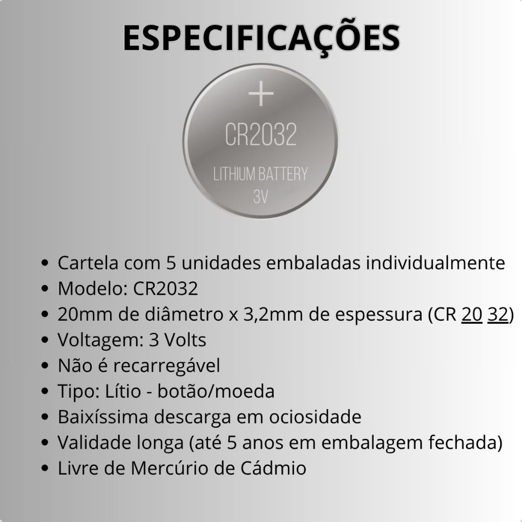 | Bateria de Lítio tipo moeda Cr2032 3v - 10 Cartelas (50 Unidades) este produto | R$ 66,00 | — | 5.0/5 | 5 |