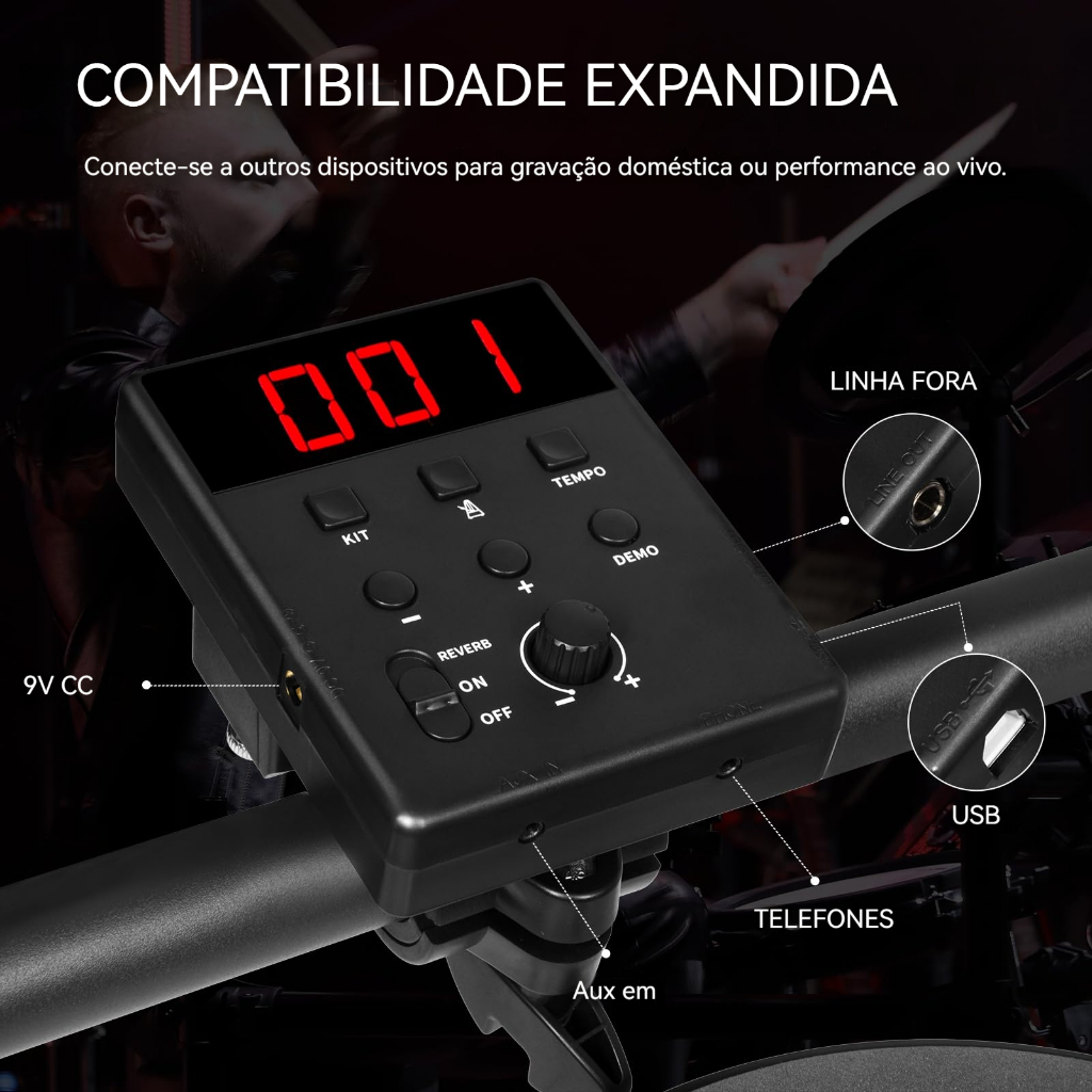 [Conjunto completo de bateria eléctrica]: O conjunto de bateria eléctrica proporciona uma experiência de percussão realista, equipado com pads de bateria de 4x8 polegadas, pratos de 3x10 polegadas, 20 músicas de acompanhamento e 120 sons diferentes, uma área de percussão completa, uma estrutura metálica resistente, módulo de bateria, base de bateria, baquetas, auscultadores e todos os fios necessários. É portátil, dobrável e fácil de guardar e praticar. Inclui banco de bateria, baquetas, auscultadores e fios [Original Drum Sound Sample]: A bateria eletrónica foi concebida especificamente para jovens principiantes, e a bateria original da bateria real é amostrada para restaurar altamente o timbre de cada conjunto de bateria. Inclui 120 sons diferentes, 20 conjuntos de bateria e 20 canções de demonstração, abrangendo uma variedade de estilos musicais. Ajuda-o a aprender melhor Leve e portátil: móvel e dobrável, conveniente para transporte e espaço de armazenamento, adequado para actuações em casa e no exterior. A bateria eletrónica está equipada com uma superfície de bateria de esponja rebound de alta densidade de 8 polegadas mais requintada, que se assemelha a uma bateria real e é mais durável. A entrada AUX e a saída USB MIDI podem ajudá-lo a criar as suas próprias batidas e música