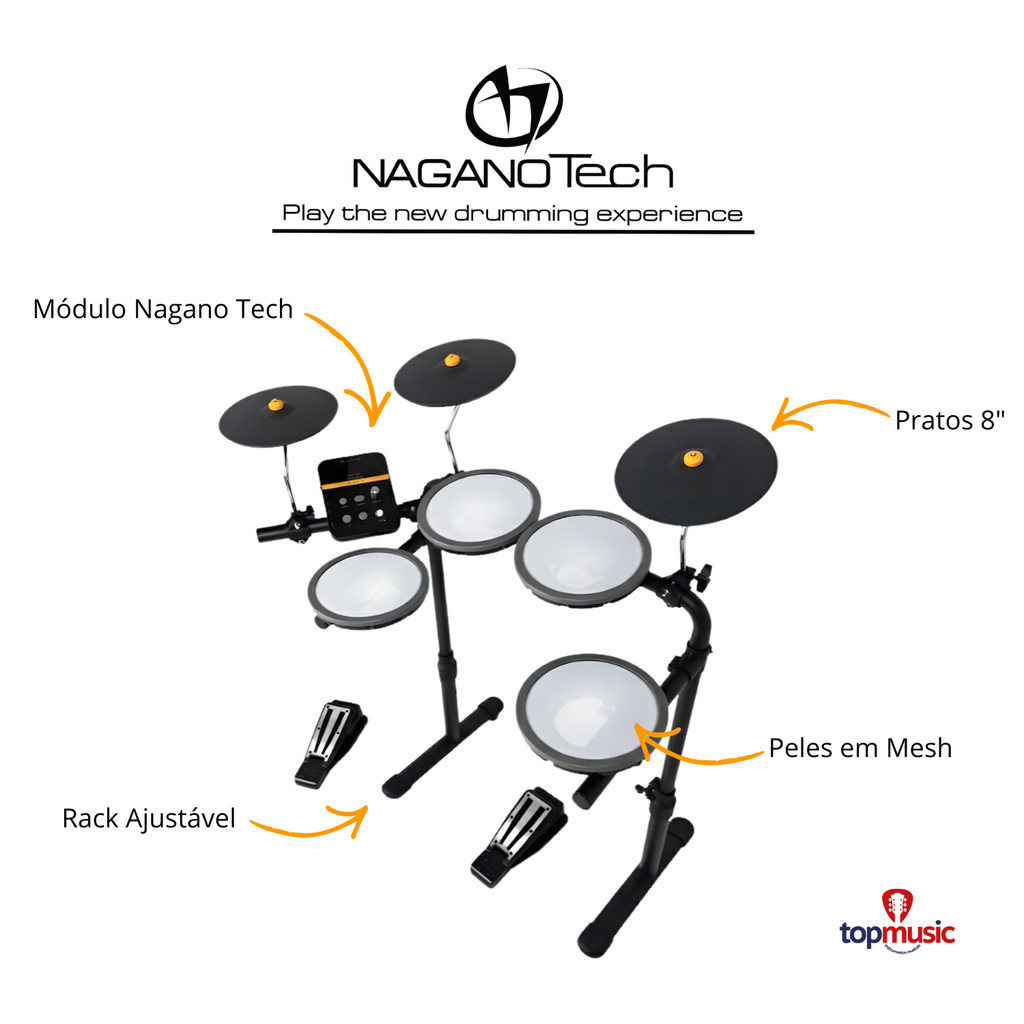 Bateria Eletrônica NAGANOTECH FAMILY - NTF-01 A Solução Compacta, Versátil e Conectada para Todas as Gerações. Descubra a liberdade de tocar bateria onde e quando quiser com a NAGANOTECH FAMILY NTF-01. Projetada para músicos que valorizam a praticidade, este kit é a definição de portabilidade: tão compacta que cabe facilmente no banco da frente do seu carro. Seja você um iniciante dando as primeiras baquetadas, um músico que precisa otimizar o espaço de estudo em um apartamento, ou um produtor buscando um kit ágil para pré-produções, a NTF-01 é a escolha essencial que se adapta ao seu estilo de vida. Principais Características e Benefícios Uma Bateria para a Família Inteira (Design Ajustável) O nome "Family" não é por acaso. A NTF-01 foi construída para ser usada e passada por gerações. Seu rack super versátil possui um sistema de regulagem de altura simples e eficiente, permitindo que o kit seja ajustado perfeitamente tanto para o uso de crianças quanto de adultos em segundos. Sensação Realista com Mesh Heads Apesar de compacta, ela não economiza na qualidade da performance. O kit vem equipado com Mesh Heads (peles de malha) nos pads de tambor de 8 polegadas, oferecendo um rebote realista e uma prática muito mais silenciosa do que os pads de borracha tradicionais. Completa o conjunto pads de prato de 8" e pedais de ação direta (bumbo e chimbal) para uma resposta imediata. Módulo Intuitivo e Som Surpreendente Não se engane pela simplicidade aparente: o módulo de som da NTF-01 é surpreendente. Prático e intuitivo, ele já vem carregado com tudo o que você precisa para começar a tocar imediatamente: 68 sons variados. 12 kits de bateria pré-configurados. 10 Play-Alongs nativos de vários estilos musicais para acompanhar. Funções essenciais como click programável (metrônomo) e ajustes finos de som e sensibilidade. Transforme-a em uma Controladora MIDI O grande diferencial tecnológico da NAGANOTECH FAMILY é sua conectividade. Através da porta USB, você pode transformar sua bateria em uma poderosa controladora MIDI. Conecte-a ao seu computador e expanda suas possibilidades sonoras ao infinito, utilizando softwares externos de produção musical e VSTs compatíveis. Especificações Técnicas: Modelo: NTF-01 (Naganotech Family) Pads de Tambor: 8 polegadas com Mesh Heads (Peles de malha) Pads de Prato: 8 polegadas Pedais: Ação direta para Bumbo e Chimbal Rack: Ajustável (Adulto/Infantil) Sons: 68 vozes / 12 Kits Presets Acompanhamentos: 10 Play-Alongs Conectividade: USB (MIDI), Entrada Auxiliar (P2), Saída de Fone (P2), Saída de Monitor Mono (P10). NAGANOTECH FAMILY NTF-01: Prática para transportar, fácil de ajustar e pronta para conectar. Garantia de fábrica: 90 dias