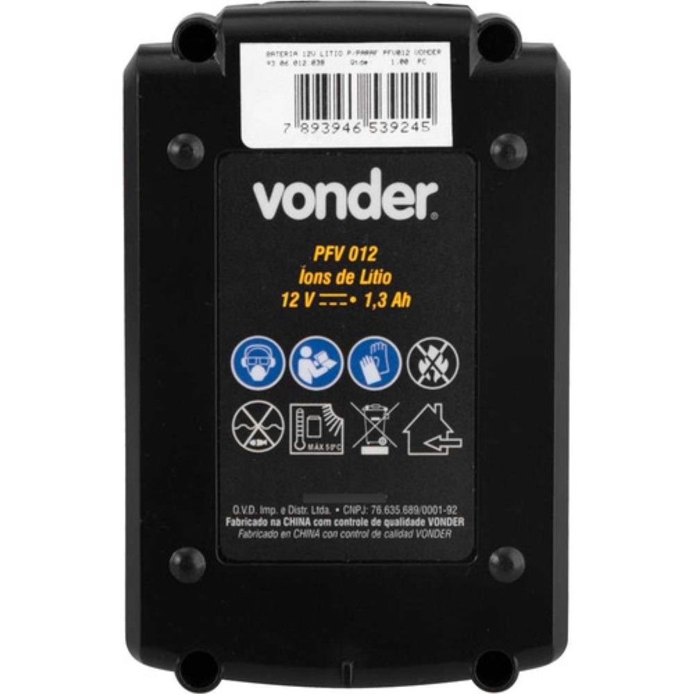 Bateria 12,0 V, Íons De Lítio, Para Parafusadeira, Furadeira, Pfv 012, Vonder Bateria de íons de lítio, garantindo alta eficiência de operação. Indicada para a parafusadeira/furadeira PFV 012, PFV 012I, PFV 112QR e PFV 074 VONDER. Especificações Técnicas: Tipo de bateria: Íons de lítio Tensão (V): 12 V Capacidade da bateria (A): 1,3 Ah Indicador de bateria fraca: Não Massa aproximada (peso) (kg): 0.269 kg Conteúdo da Embalagem: 1 Bateria.