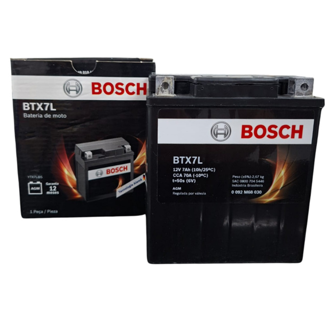 A bateria Bosch BTX7L 12V 7Ah é projetada para quem busca partida confiável e desempenho duradouro em motos de baixa e média cilindrada. Com tecnologia selada AGM e sistema VRLA, ela vem ativada e pronta para uso, sem necessidade de manutenção ou manuseio de ácido. Sua construção robusta e homologação garantem segurança, estabilidade no sistema elétrico e forte resistência a vibrações e impactos, ideal para uso urbano ou em estrada. Dados técnicos e diferenciais A bateria tem voltagem de 12 V, capacidade nominal de 7 Ah e corrente de partida a frio (CCA) de aproximadamente 70 A. Utiliza tecnologia AGM com eletrólito absorvido por manta de fibra de vidro, o que assegura melhor retenção de carga, maior durabilidade, recarga eficiente e funcionamento estável mesmo em condições adversas. A construção reforçada, com placas laminadas e materiais resistentes à corrosão e vibrações, prolonga a vida útil do produto e garante partidas seguras. Dimensões e peso As dimensões aproximadas da bateria são 114 mm de comprimento, 71 mm de largura e 131 mm de altura. O peso varia entre aproximadamente 2,3 kg e 2,5 kg, dependendo da versão. Conteúdo da embalagem A embalagem contém a bateria Bosch BTX7L 12V 7Ah, já ativada e selada de fábrica, pronta para instalação imediata — não é necessário adicionar ácido nem realizar manutenção antes do uso. Características de destaque Bateria selada e livre de manutenção oferecendo praticidade e segurança. Partida confiável e estável, mesmo em baixas temperaturas ou após longos períodos parado. Construção robusta, resistente a vibrações e impactos, com materiais de alta durabilidade. Compacta e de fácil instalação em compartimentos padrão de motos. Compatível com diversos modelos de motocicletas e scooters, inclusive para uso urbano e estrada. Produto original Bosch, homologado e com qualidade reconhecida. Garantia: Após 90 dias a garantia só será valida mediante apresentação do certificado devidamente preenchido.