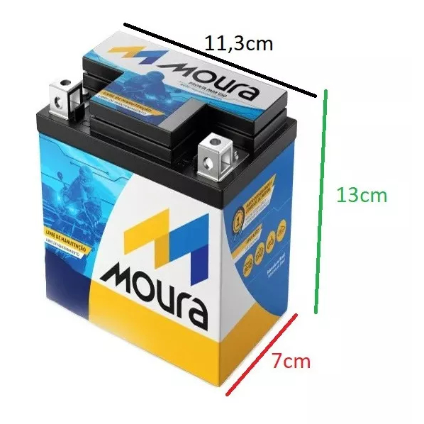Descrição do produto > Bateria Moura MA6-D (6AH) > Bateria AGM/VRLA selada, lacrada, livre de manutenção > Homologada pelo Inmetro (amperagem real) > 6 meses de garantia nacional Moura, pode ser acionada em qualquer representante Moura do Brasil > Qualidade Baterias Moura Medidas: 11,4cm (comprimento) x 7,1cm (largura) x 13,1cm (altura) Aplicações: HONDA - YAMAHA - SUNDOWN - SUSUKI - KAWASAKI - KASINSKI - DAFRA APACHE 150 2010 > 2015 CB 300R 2000 > 2015 CB 300R FLEX 2010 > 2015 CB 600F HORNET 2005 > 2007 CBX 250 TWISTER 2001 > 2009 CG 150 Fan 2010 > 2015 (VERIFICAR MEDIDA DA CAIXA BATERIA) CG 150 GARGO 2015 > 2015 (VERIFICAR MEDIDA DA CAIXA BATERIA) CRF 250L 2013 > 2014 LEAD 110 2010 > 2015 NX 400i FALCON TODAS NX-4 400 FALCON TODAS XR 250 TORNADO 2001 > 2009 HUNTER 125 2004 > 2009 MAX SE 125 2001 > 2011 MAX SED 125 2004 > 2014 MOTARD 125 2010 > 2011 MOTARD 200 2007 > 2008 STX 125 2010 > 2011 STX 200 2007 > 2008 SKY 125 2011 > 2016 TSS 150 2011 > 2016 FLY 150 2016 > TSS 250 2015 > FLY 250 2015 > MONTEZ 250 2012 > 2015 SKY 110 2003 > 2011 FLY 125 2011 > 2013 WORK 125 2010 > 2016 R3 2015 > ATENÇÃO - Não nos responsabilizamos pelo mau uso ou instalação indevida do produto, sempre recomendamos que a instalação seja feita por um profissional especializado. - Imagens meramente ilustrativas.
