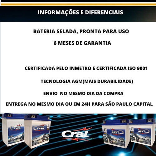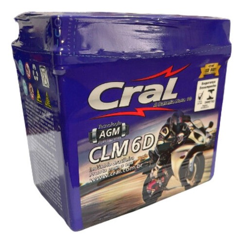 Bateria Moto Cral 6ah 12V CLM6D Livre de Manutenção e totalmente selada. Linha especialmente desenvolvida para motocicletas. Fabricada com tecnologia de ponta AGM Certificada pelo INMETRO e ISO 9001. 6 meses de garantia nacional Fabricada com o que há de mais moderno para atender um público mais exigente, onde a bateria dispensa manutenção e é totalmente selada. Principais Aplicações: Honda: Pop 100, Biz 125 ES/KS, CG 125 Cargo/Fan/Titan/Today, XLS 125, CG 150 Titan, NX 150, NXR 150 Bros, NX 200, XR 200, CRF 230 F, TRX-90 ( Quadriciclo ) - Shineray: 125 ESD - Sundown: Hunter 90/100, Web 100 -Yamaha: Factor YBR 125 E/ED/K, TTR 230, WR 250 F - Polaris (Quadriciclo): Scrambler, Predattor Sportsman - Suzuki (Quadriciclo): Quadsport Z50, LT 80 Quadsport80 Especificações Técnicas: Tensão: 12V C10 : 6Ah CCA -10º C: 60 Dimensões ( Comp x Larg x Alt ): 113 x 70 x 105mm