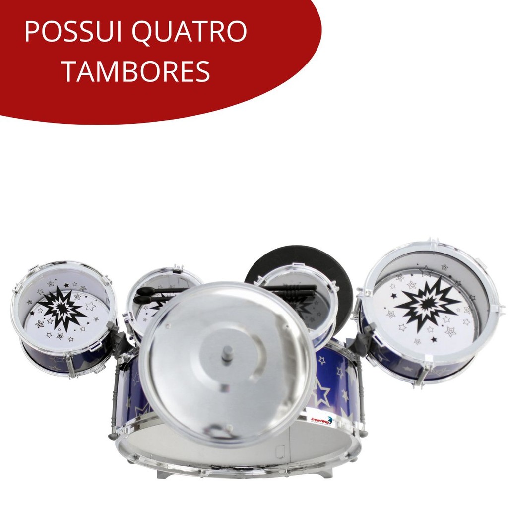 Bateria Musical Infantil, 5 Tambores com Banquinho e Baqueta, Azul