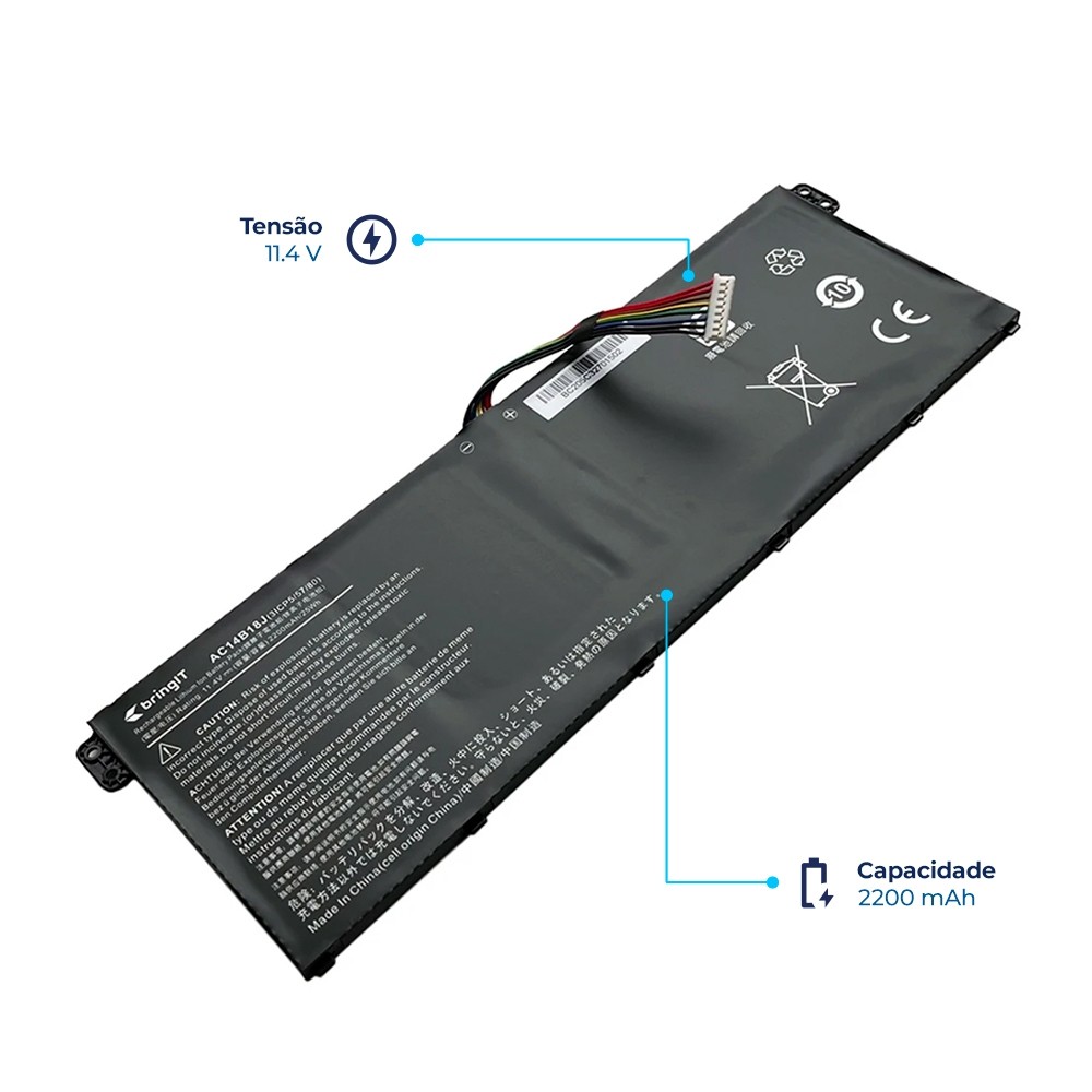 Bateria para Notebook Acer Aspire 5 A515-54G-77RU A Bateria Acer Aspire 5 A515-54G-77RU possui um excelente sistema de recarga inteligente que impede o sobrecarregamento e superaquecimento da peça. Também conta com células de íons de lítio, imunes ao 'efeito memória', são mais potentes e garantem um melhor desempenho. Ressaltamos que o produto foi aprovado por rigorosos testes de qualidade e atende todas as exigências do seu aparelho. Além de possuir 12 meses de garantia contra defeitos de fabricação. Atenção: Essa é uma bateria bringIT, portanto não é um produto original da fabricante Acer. Caso seja necessário, todo o suporte e garantia do produto serão oferecidos pela nossa equipe. Para evitar problemas de compatibilidade, por favor verifique as especificações da sua bateria. Marca: bringIT Modelo: A515-54G-77RU Capacidade: 2200 mAh Quantidade de Células: Lítio-Polímero Voltagem: 11.4 V Cor: Preto Referência: BC205-AC-0317 Atenção: Para que essa bateria seja compatível com seu notebook, a voltagem deverá ser igual ou equivalente a descrita no anúncio. A variação de voltagem de uma bateria pode chegar a até 10%. Portanto, se a voltagem for a mesma ou equivalente (dentro dessa variação), a bateria será compatível com seu notebook. Por exemplo: - 11.1V é compatível com 10.8V - 14.8V é compatível com 14.4V - 10.8V não é compatível com 14.4V Esse produto é compatível com os notebooks: ES1-531-C3CC, ES1-531-P416, ES1-572-3562, ES1-531-C6FQ, 11 CB3-111, ES1-531-31XM, AC14B18J, ES1-531-P0JJ, AC14B8K, 13 CB5-311-T1UU, ES1-531-C3HE Ficou na dúvida da compatibilidade ou precisa de mais informações? Deixe sua pergunta que nosso time técnico especializado está preparado para auxiliar! A bringIT é líder de mercado com o maior mix de produtos e peças para notebook: Baterias, telas, teclados e carregadores compatíveis com as marcas: Dell, Lenovo, Acer, HP, Asus e muito mais!