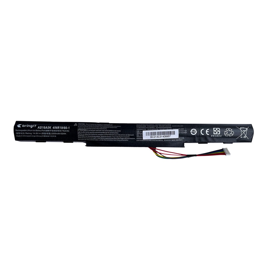 Bateria para Notebook Acer Aspire F5-573-51LJ | 4 Células Esta é uma Bateria bringIT compatível com o notebook Acer Aspire F5-573-51LJ. Com alta durabilidade e qualidade, as baterias bringIT são de confiança e possuem compatibilidade garantida. Com excelente desempenho, possui proteção contra sobrecarregamento e sobreaquecimento. Além disso, as células são de íons de lítio (lithium-ion) e imunes ao “efeito memória”, ou seja, não viciam. Atenção! Essa é uma bateria bringIT, portanto não é um produto original da fabricante Acer. Caso seja necessário, todo o suporte e garantia do produto serão oferecidos pela nossa equipe. Para evitar problemas de compatibilidade, por favor verifique as especificações da sua bateria. Para evitar problemas de compatibilidade, compare as fotos deste anúncio com seu equipamento original. Assim você consegue verificar as principais informações de compatibilidade e demais especificações da sua bateria. Informações Técnicas Quantidade de células: 4 Células Capacidade: 2200 mAh Tensão (Voltagem): 14.6 V Tensões equivalentes: 10.8V = 11.1V e 14.4V = 14.8V Cor: Preto Garantia: 12 meses de garantia contra defeitos de fabricação Referência: BC213