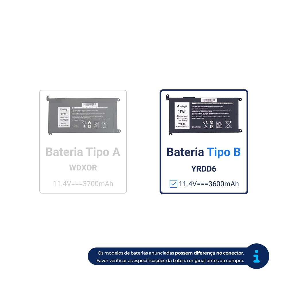 Bateria para Notebook Dell Inspiron P90F A Bateria Dell Inspiron P90F possui um excelente sistema de recarga inteligente que impede o sobrecarregamento e superaquecimento da peça. Também conta com células de íons de lítio, imunes ao 'efeito memória', são mais potentes e garantem um melhor desempenho. Ressaltamos que o produto foi aprovado por rigorosos testes de qualidade e atende todas as exigências do seu aparelho. Além de possuir 12 meses de garantia contra defeitos de fabricação. Importante: esta bateria é compatível com o part number YRDD6, verifique na bateria original o part number impresso antes de efetuar a compra. Atenção: Essa é uma bateria bringIT, portanto não é um produto original da fabricante Acer. Caso seja necessário, todo o suporte e garantia do produto serão oferecidos pela nossa equipe. Para evitar problemas de compatibilidade, por favor verifique as especificações da sua bateria. Marca: bringIT Modelo: P90F Capacidade: 3600 mAh Quantidade de Células: Lítio-Polímero Voltagem: 11.4 V Cor: Preto Referência: BC354-DE-0032 Atenção: Para que essa bateria seja compatível com seu notebook, a voltagem deverá ser igual ou equivalente a descrita no anúncio. A variação de voltagem de uma bateria pode chegar a até 10%. Portanto, se a voltagem for a mesma ou equivalente (dentro dessa variação), a bateria será compatível com seu notebook. Por exemplo: - 11.1V é compatível com 10.8V - 14.8V é compatível com 14.4V - 10.8V não é compatível com 14.4V Esse produto é compatível com os notebooks: Dell Inspiron 5480 5482 5485 5493 Yrdd6 Ficou na dúvida da compatibilidade ou precisa de mais informações? Deixe sua pergunta que nosso time técnico especializado está preparado para auxiliar! A bringIT é líder de mercado com o maior mix de produtos e peças para notebook: Baterias, telas, teclados e carregadores compatíveis com as marcas: Dell, Lenovo, Acer, HP, Asus e muito mais!