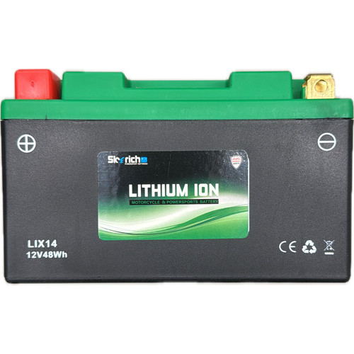 BATERIA SKYRICH LITIUM – LIX14 PRODUTO ORIGINAL SKYRICH COM NOTA FISCAL - Informações técnicas: Peso: 0,660 kg Dimensões: 9,00 A × 6,5 L × 15,0 C cm CCA: 240 A Garantia (meses): 12 Marca: SkyRich Polaridade: E – Positivo lado Esquerdo Referência: YTX9B-BS / YTX10-BS / YTX12-BS / YTX14-BS Tensão: 12v Tipo: Lithium Veículos: CB500X / CB500F /XT660/ XJ6/ HORNET09 MT09 R6/ MT03 08/ KTM DUKE 660/ / MODELO BATERIA YTX12-BS: SHADOW 750/ GSXR1100/ GSX1300RHYABUZA/ GSXR750 SRAD/ CBR100 BLACKBIRD/ ER-5/ GSF1200 BANDIT/ MARAUDER VZ800/ TDM850/ BOULEVARD M800/ SPEED TRIPLE/ TRANSALP/ VT750/ TIGER SPEED TRIPLE/ ZX11 NINJA/ ATV FOUR TRAX/ BMW F600/ F800/ F700/S1000R/R1200GS/ KTM ADVENTURE/DUKE/G310 GS-T/F750-850/GS1200R-1250/S1000RR / Suzuki DR 800S / DL 1000 V-strom / Burgman 650 / Kasinski Comet GT/GTR 250/650 / Mirage 650/250 / Honda VT 1100 C Shadow 00...07 / Kawasaki Vulcan 800/900 / Ninja ZX 11 / ZX 12R 00...04 / ZX 14 06... / BMW F650GS 08... / F800GS 08... / R1200GS 09... / K1200 05... / K1300 09... / Husqvarna SM 610 / TE 610 / Malaguti SpiderMax 500 / Triumph Daytona 955 / Speed Triple 1050 / Tiger 955 / Buell S1 1200 Lightning 96...99 / Piaggio MP3 / Harley Davidson VRSC V-Rod 02...07 / Buell XB9RXB12R Firebolt / XB9S/XB12S Lightning 02...10 / XB12X Ulysses