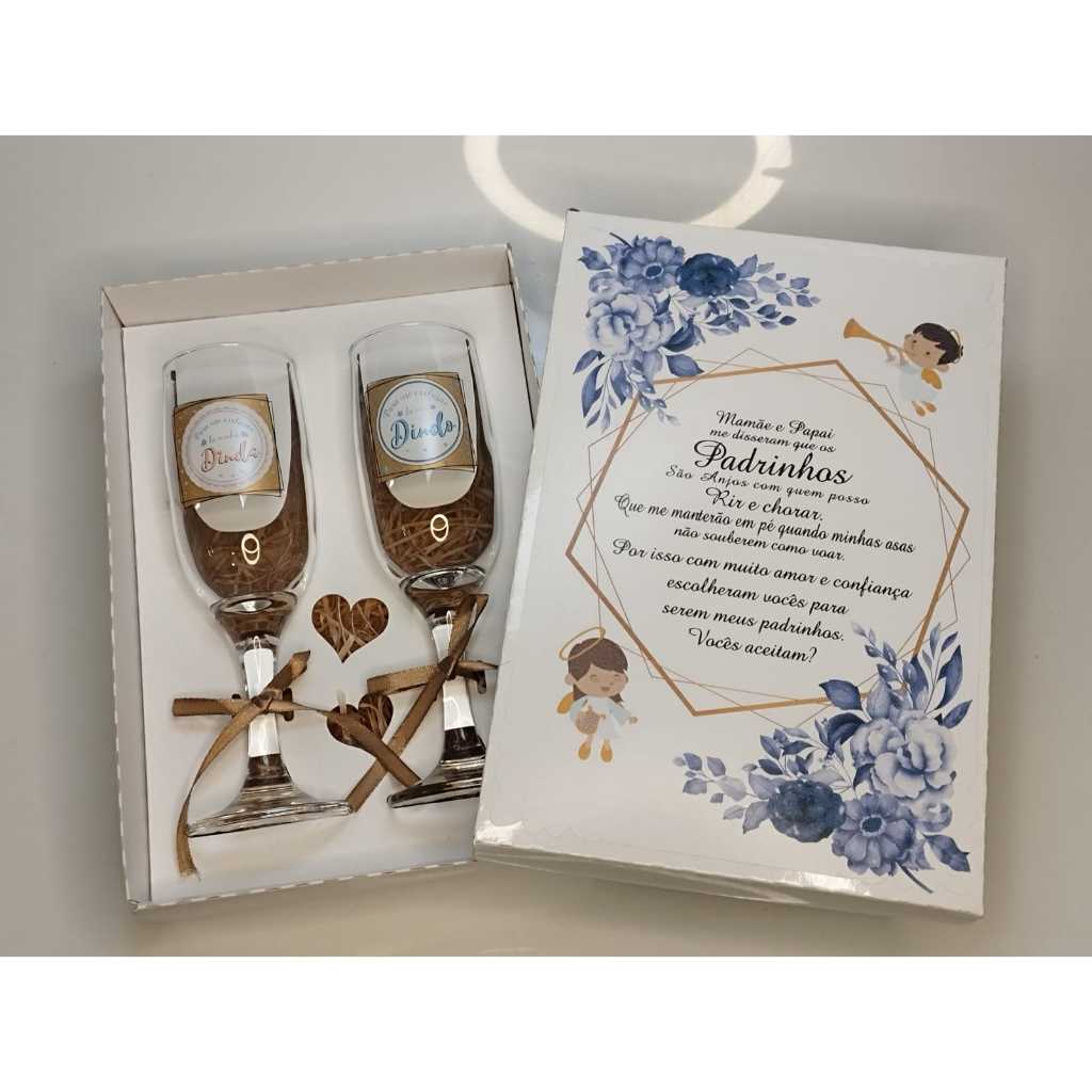 Batizado Caixa convite casal padrinhos com taças de vidro Dindo e Dinda