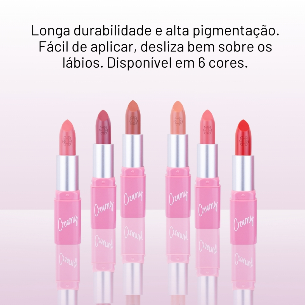 O Creamy é um batom cremoso, enriquecido com vitamina E, que ajuda a manter a hidratação dos lábios ao longo do dia. Disponível em seis cores altamente pigmentadas. O Creamy é fácil de aplicar e fica confortável nos lábios. Enriquecido com vitamina E e ácido hialurônico. Tem ação hidratante e antioxidante Modo de uso: Aplique diretamente nos lábios. Ingredientes: Tridecyl Trimellitate/Trimelitato de Tridecila, Paraffinum Liquidum/Parafina Líquida, Synthetic Wax/Cera Sintética, Ethylhexyl Palmitate/Palmitato de Etilexila, Polyisobutene/Poliisobuteno, Microcrystalline Wax/Cera Microcristalina, Parfum/Perfume, Phenoxyethanol/Fenoxietanol, Tocopheryl Acetate/Acetato de Tocoferila. Pode conter (+/-): CI 77891/Corante Branco 77891, CI 77491/Corante Vermelho 77491, CI 77492/Corante Amarelo 77492, CI 45410/Corante Vermelho 45410, Pigment Red 57:1/Pigmento Vermelho 57:1, Pigment Red 57/Pigmento Vermelho 57, CI 77499/Corante Preto 77499. *Produto Vegano/Livre de parabenos*