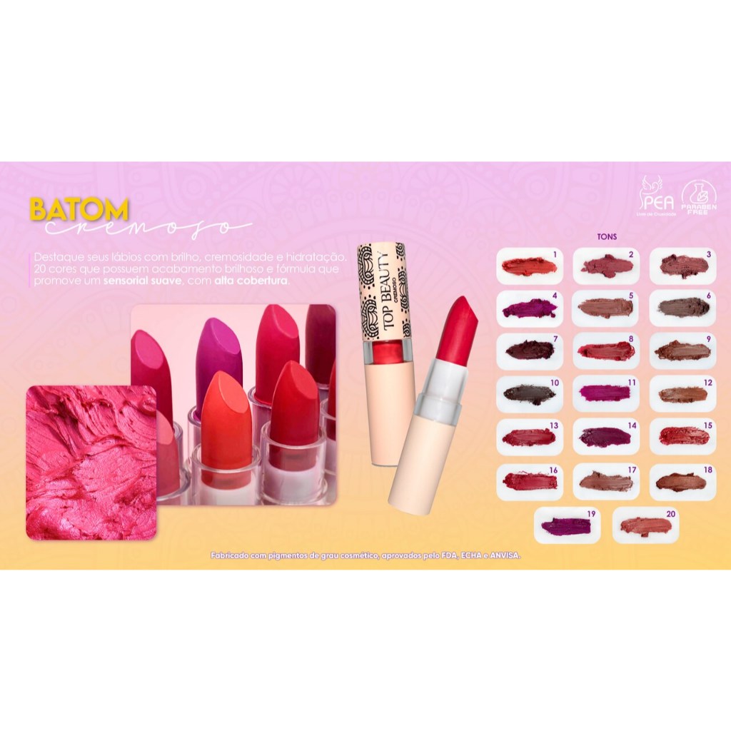 | Batom Cremoso Cor 04 Top Beauty Make este produto | R$ 12,50 | 58% | 4.9/5 | — |