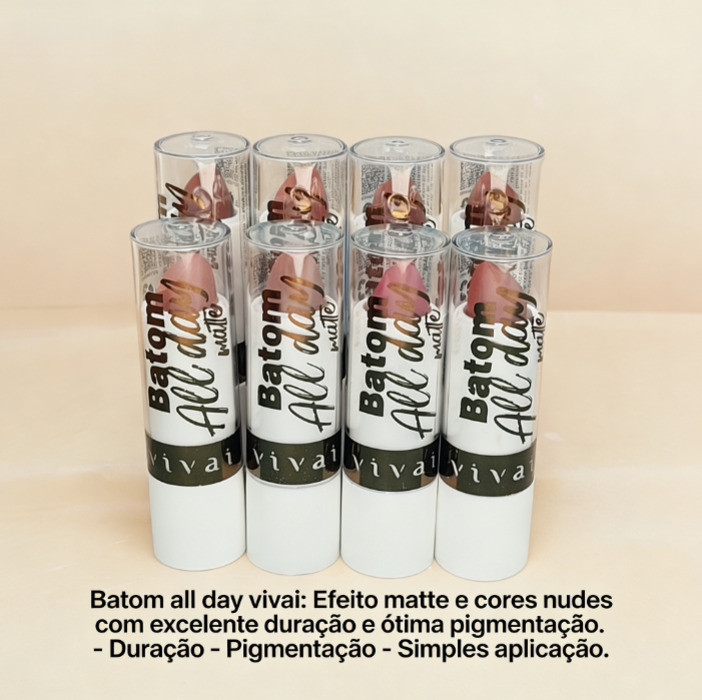 Batom Matte Vivai All Day - 8 Cores Nudes, Acabamento Natural ✨ Características: 8 cores nudes Acabamento matte natural Textura leve e macia Cobertura equilibrada Uso diário 💡 Como usar: Aplique diretamente nos lábios. Para maior precisão, use um lápis labial. ⚠️ Aviso: Uso externo. Em caso de irritação, suspenda o uso. 🧴 Marca: Vivai