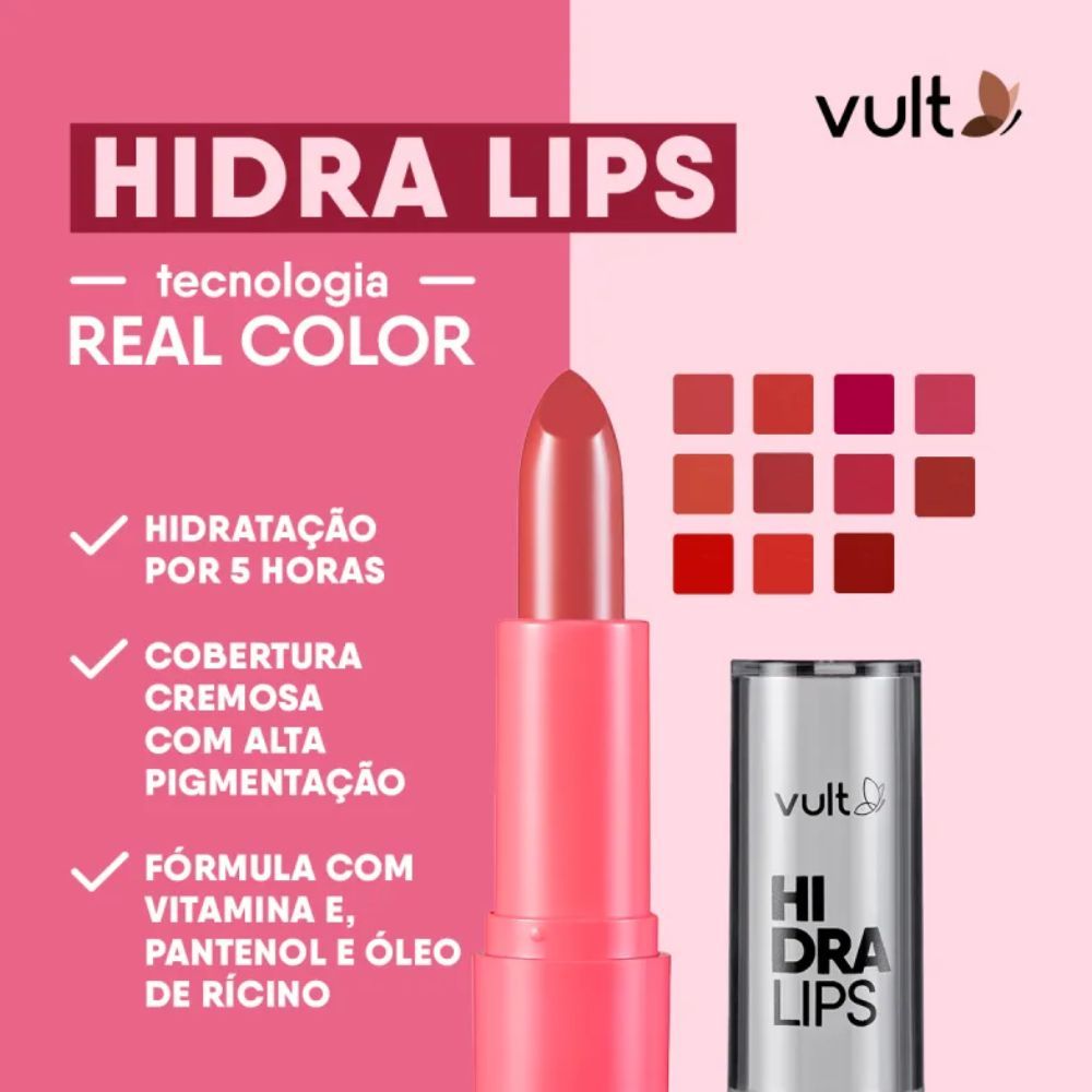 Vult Hidra Lips Rose Gold Batom cremoso Vult Hidra Lips possui textura cremosa e confortável que proporciona alta pigmentação e hidratação por 5 horas. O Batom Cremoso Vult Hidra Lips apresenta fórmul