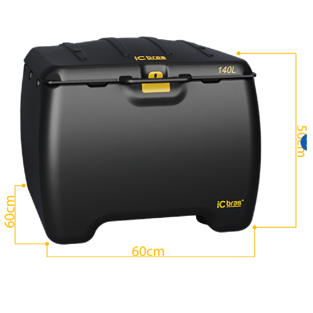 Descrição do baú -Baú para motocicleta feito no material PEAD, na cor preto, -Tampa com parede dupla, com compartimento para documentos. -Possibilidade de conectar tubos plásticos para transporte de banners e cartazes. -Furos para prender rede e guardar o capacete. -Possibilidade de personalização da caixa através da aplicação de adesivos em suas laterais e/ou através de bandeira fixada em suporte ICbras. -Dimensões do baú: 60 cm x 50 cm x 60 cm. -Abertura do baú: 50x50. Baú para moto 140 litros O baú plástico para moto de 140 litros foi desenvolvido para atender as mais diversas necessidades dos motociclistas, com recursos extras em seu design para facilitar o transporte de itens. A tampa da caixa de plástico tem parede dupla e na parte interna há um compartimento para carregar documentos com total segurança, sem risco de amassá-los. Há também duas áreas específicas para acoplar alongadores plásticos, ideal para carregar banners e cartazes. Nos quatro cantos da tampa da caixa de plástico para moto existem pequenos furos para prender a rede e guardar o capacete. É possível personalizar a caixa plástica com a logo da empresa e/ou com a bandeira a ser acoplada.