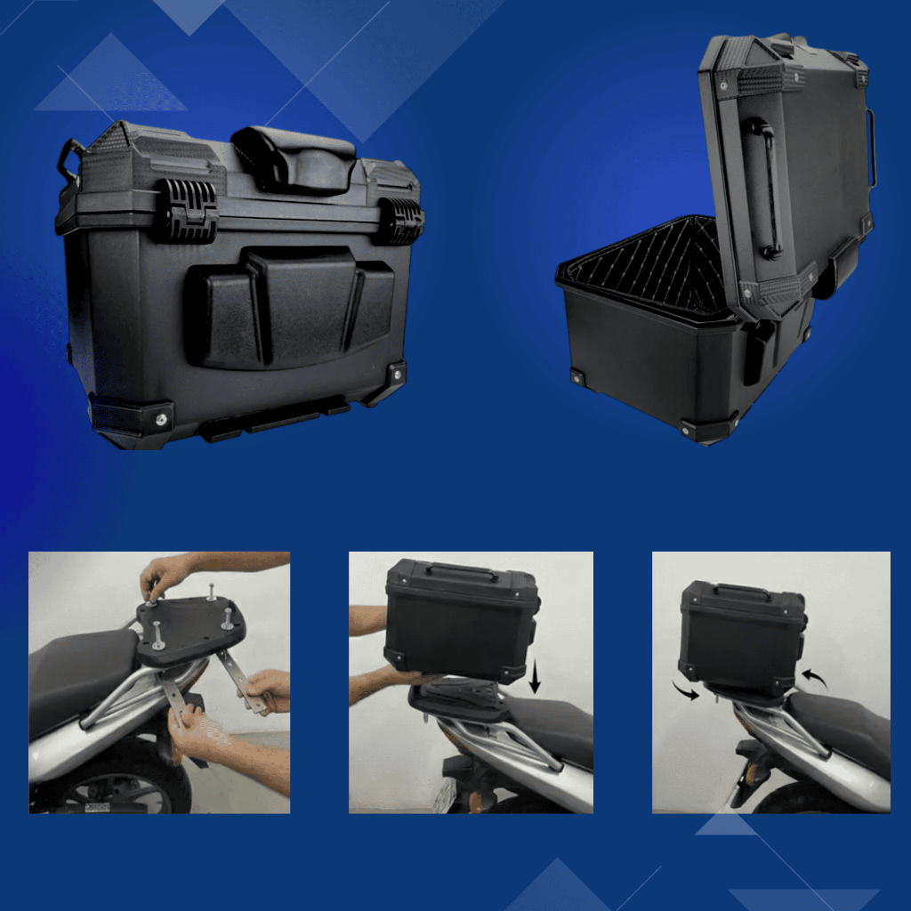 BAULETO ABS 45 LITROS - COM ENCOSTO DE BRINDE! Dê um toque de estilo e praticidade à sua moto com nosso baú de ABS 45L! Produzido em material de alta resistência e acabamento premium, ele oferece durabilidade, segurança e um design moderno, perfeito para o uso no dia a dia ou em longas viagens. Especificações: - Capacidade em volumes: 45L (um capacete) - Carga recomendada: 5kg (variando até 7kg de acordo com a resistência do suporte) - Fechadura com chave (acompanha duas chaves); - Acompanha kit de fixação do produto; - Material em plástico ABS; - Comprimento: 44cm; - Altura: 33,5cm; - Largura: 37cm.