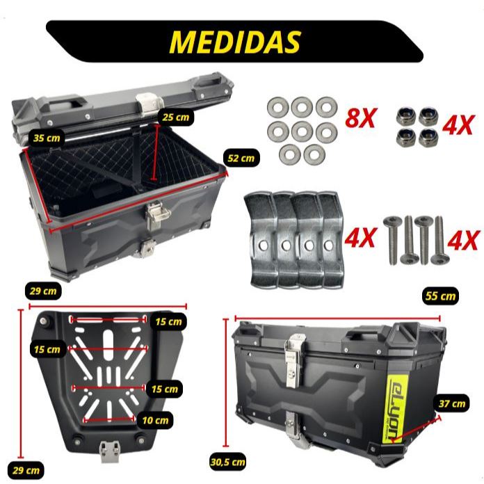 BAÚ 65 LITROS MODELO REFORÇADO UNIVERSAL ACOMPANHA NA EMBALAGEM: 1 Baú completo de ACM; 1 Suporte de fixação do baú desmontável com diversas medidas; 2 Chaves do baú e do suporte; 4 Braçadeiras para fixação do suporte na churrasqueira; 4 Parafusos allen de fixação 42,55mm; 4 Porcas de fixação; 8 Arruelas; 2 Fitas reflexivas amarelas (já coladas, mas podem ser removidas). Revestimento interno em couro sintético personalizado com bolsos e cinto. Todos os itens necessários para instalação do baú em sua moto estão neste kit, inclusive as chaves para aperto, desta maneira a instalação é simples para utilização em sua moto. COR: Preto. O material do baú é ACM, que é a sigla para Aluminium Composite Material, ou material composto de alumínio em português. É um tipo de material de construção composto por duas camadas externas de alumínio e um núcleo de polietileno. - Durabilidade: O ACM é altamente resistente a condições climáticas adversas, como chuva, vento e sol, e não é suscetível à corrosão, o que o torna uma opção durável e de baixa manutenção; - Resistência ao Impacto: O ACM possui boa resistência ao impacto, o que significa que os baús podem suportar cargas e golpes sem deformar ou danificar facilmente; - Segurança: Os baús de ACM são projetados para oferecer boa segurança, com fechaduras e mecanismos robustos que podem proteger o conteúdo armazenado de forma eficiente; - Leveza: Os baús de ACM são mais leves do que os feitos com materiais metálicos sólidos ou madeiras pesadas, facilitando o transporte e a movimentação.