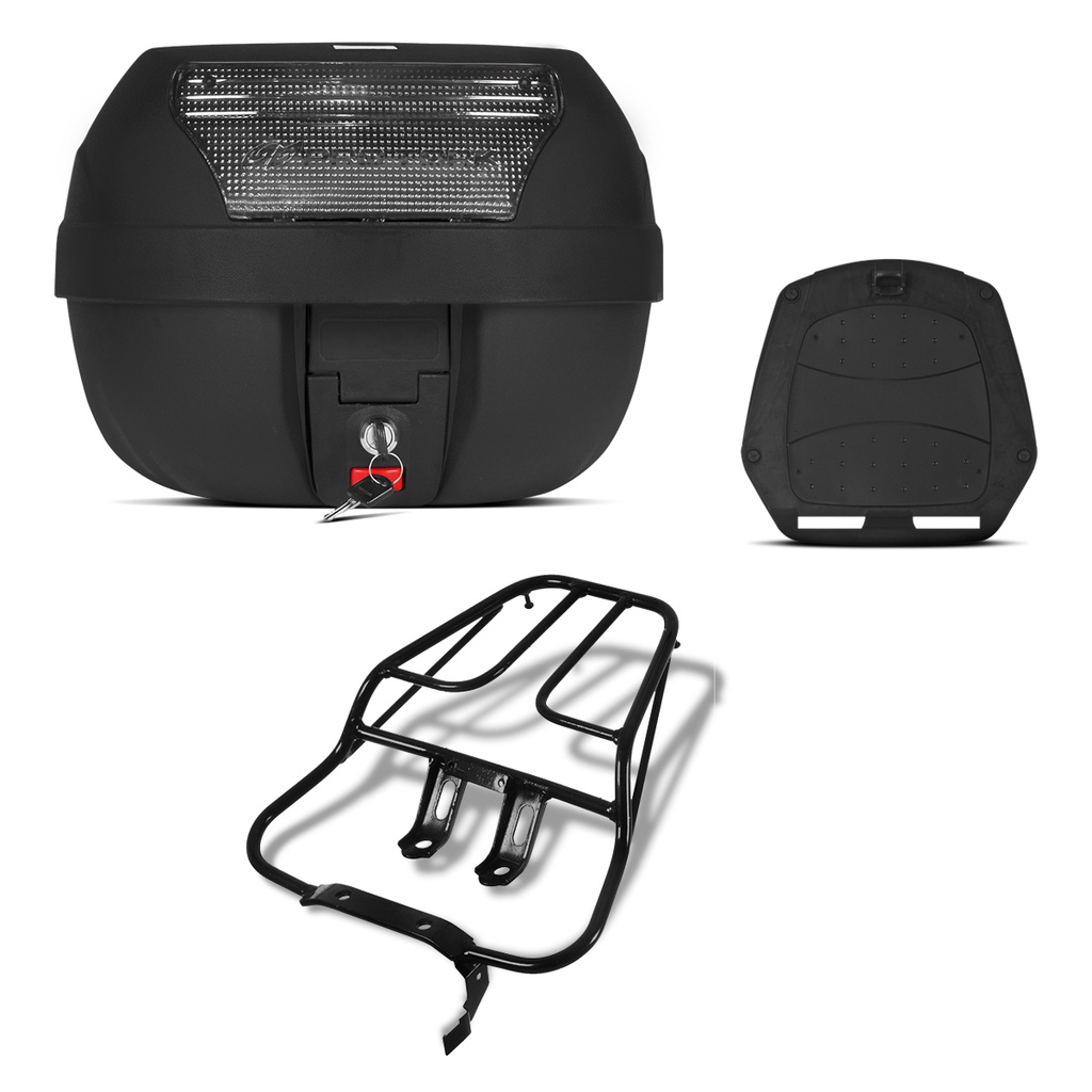 Com um sistema prático de abertura e com uma firme fixação rápida, o Baú SmartBox 2 possui um conjunto completo para que possa ser fixado ao bagageiro. Já os bagageiros em aço Pro Tork são produzidos com materiais de excelente qualidade, garantindo maior vida útil ao produto. Sua pintura eletrostática também é outro diferencial, resistindo por muito mais às ações do tempo. Baú 28 Litros Smartbox 2: - Marca: Pro Tork; - Fabricado em injeção Polipropileno de alta qualidade; - Capacidade: 28 litros (1 capacete e uma capa de chuva); - Fechadura com Chave (completa); - Lente com Defletor traseiro; - Acompanha Parafusos e Base para a fixação do baú; - Recomenda-se instalar o produto no bagageiro em aço; - Peso Máximo suportado de 3kg. Bagageiro em Aço Maciço: - Modelo: Sansão; - Marca: Pro Tork; - Fabricado em Aço Maciço; - Peso máximo suportado: 6kg. Aplicação: - Titan 150 2004; - Titan 150 2005; - Titan 150 2006; - Titan 150 2007; - Titan 150 2008. - Antes de finalizar a compra, certifique-se de que sua moto seja compatível com algum dos modelos acima. Pois o produto é pronto para instalação e não necessita de nenhum tipo de adaptação. - Para realizar a instalação, leve sua moto à uma oficina especializada. Nós não nos responsabilizamos por danos causados pela má instalação do produto.