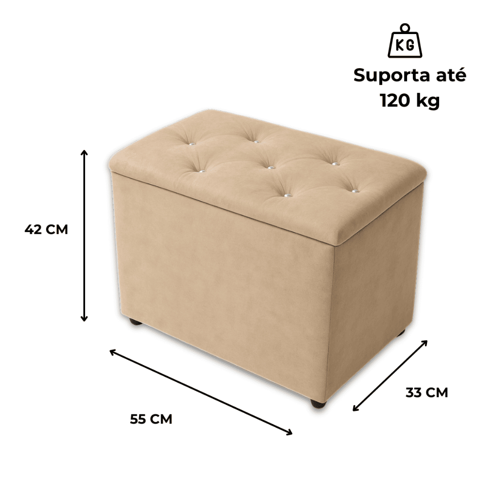 ATENÇÃO AO MATERIAL DO PUFF, ESTÁ NA DESCRIÇÃO DA COR! O Puff Báu é LINDO e CHARMOSO para sua casa, confortável para seu momento de descanso e leitura, e claro, um espaçoso armazenador de objetos. Feitos em madeira Pinus e em espuma D33, sendo o diferencial de todos os outros produtos vendidos no mercado. Focando na durabilidade do produto e conforto do usuário. Seu revestimento em couro sintético e suede além de deixar o ambiente sofisticado é de fácil limpeza. *****VAI MONTADO***** Especificações: - Material Estrutura: Madeira Pinus (Reflorestada) - Acabamento Externo: Courino ou Suede - Acabamento interno: TNT - Densidade da Espuma: D33 - Suporta até 100 kg - Peso 4 Kg - Leve, porém resistente - Fácil limpeza - Brilho e Alta durabilidade - O produto é enviado montado - Imagem Meramente Ilustrada RECOMENDAÇÕES: - O tecido não deve ser molhado em excesso. Ou seja, você nunca deverá jogar água diretamente. - Limpe utilizando produto apropriados para tecido suede ou courino, assim, manterá a durabilidade e estética do produto. - Utilize aspirador de pó para eliminar poeira e pelos de animais Dimensões Externas / Internas: Altura Externa: 43 cm Largura Externa: 34 cm Comprimento Externo: 55 cm Altura Interna: 33 cm Largura Interna: 33 cm Comprimento Interno: 55 cm Item incluso na embalagem: 1 Baú 43x34x55