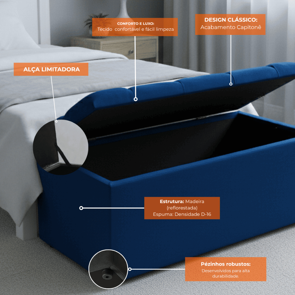 Baú Solteiro Capitonê Retangular Decoração Guarda Objetos Volumes Assento Pé de Cama
