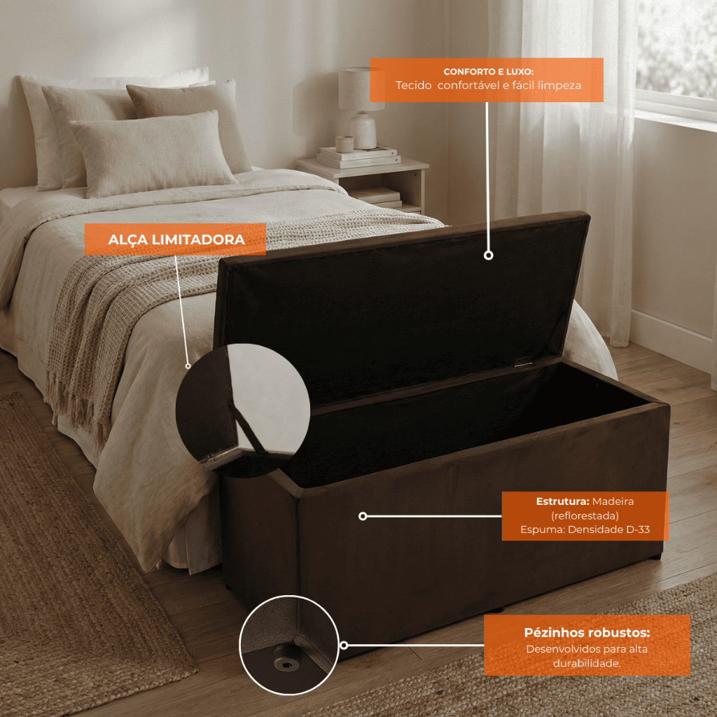 Baú Solteiro em Suede com Tampa e 6 Pés Reforçados Madeira Pinus, Espuma D33 e Espaço Interno Amplo Dimensões: Altura: 42cm; Largura: 90cm; Comprimento: 40cm; Altura interna: 30cm; Especificações: Suporta até: 200Kg; Pézinhos: 06; Quantidade de portas: 01; Materiais: Madeira Pinus e Suede; Espuma: D-33; Produto enviado montado Fácil de limpar; Acabamento interno com TNT: oferece melhor acabamento e proteção dos itens armazenados; Alças de sustentação internas: mantêm a tampa firme, evitando que ela caia ao abrir; Pezinhos reforçados: além de garantirem melhor estética, suportam mais peso do que os dos concorrentes; Espuma NOVA e higiênica: utilizamos espuma nova e livre de ácaros e bactérias, ao contrário de muitos concorrentes que usam espumas reaproveitadas de colchões antigos. Elegância e Organização em um Toque de Sofisticação Se você busca aliar praticidade, conforto e estilo em um único móvel, o Baú Solteiro é a escolha perfeita para você! Este Baú Solteiro em Suede é ideal para pé de cama solteiro, hall, salas, escritórios. Este produto não apenas complementa a decoração do seu espaço, mas também o mantém organizado de forma inteligente. Ideal para: -Sala de estar, Quartos, Varanda, Closet -Salão de beleza/barbearia, Loja de roupas e Calçados, Recepção -Casamentos e festas, Espaços de confraternização, Feiras e estandes -Salas de espera, Hall de entrada, corredores. -Lojas, Clinicas e Estúdios Conosco você encontra: -Entrega Rápida -Fabricação própria -Produção em larga escala Recomendações: Tecido Suede: Aspire semanalmente com bocal de escova macia. Evite exposição direta ao sol para prevenir desbotamento. Remova manchas com pano limpo e seco ou produto específico para suede. Faça limpeza profunda periódica com profissional especializado.