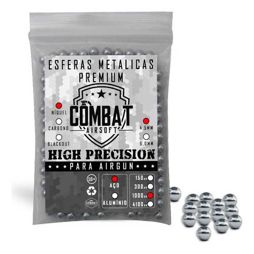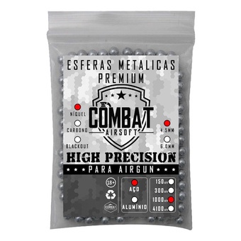 Esferas Aço Combat Airsoft Calibre 4,5mm 1000un Essas são munições confeccionadas em aço e em formato de esfera, produzidas pela Combat-Airsoft. São compatíveis com Armas de cano sem raias de calibre 4.5mm (.177). Para confirmar a compatibilidade se atente as especificações técnicas da sua Arma. Opção perfeita para atiradores que procuram treinar utilizando munição de alta qualidade e excelente custo benefício. Características: - Fabricante: Combat Airsoft - Modelo: Esferas Aço 4.5mm 1000un - Calibre: 4.5mm (.177) - Material: Aço Carbono - Formato da munição: Redonda - Compatível com Armas de cano liso - Quantidade aproximada: 4100 unidades - Peso em gramatura: 0.35gr Itens Inclusos: - 1x Stand Up de Esferas de Aço Combat-Airsoft 4.5mm 1000un. Informações adicionais - NOVA EMBALAGEM STAND UP - As imagens são meramente ilustrativas - Todos os nossos produtos são novos com garantia de 90 dias. - Mantenha o equipamento sempre lubrificado. - Utilize sempre óculos de segurança - Mantenha fora do alcance de crianças. - Não atire em pessoas ou animais. - Não reutilize as esferas