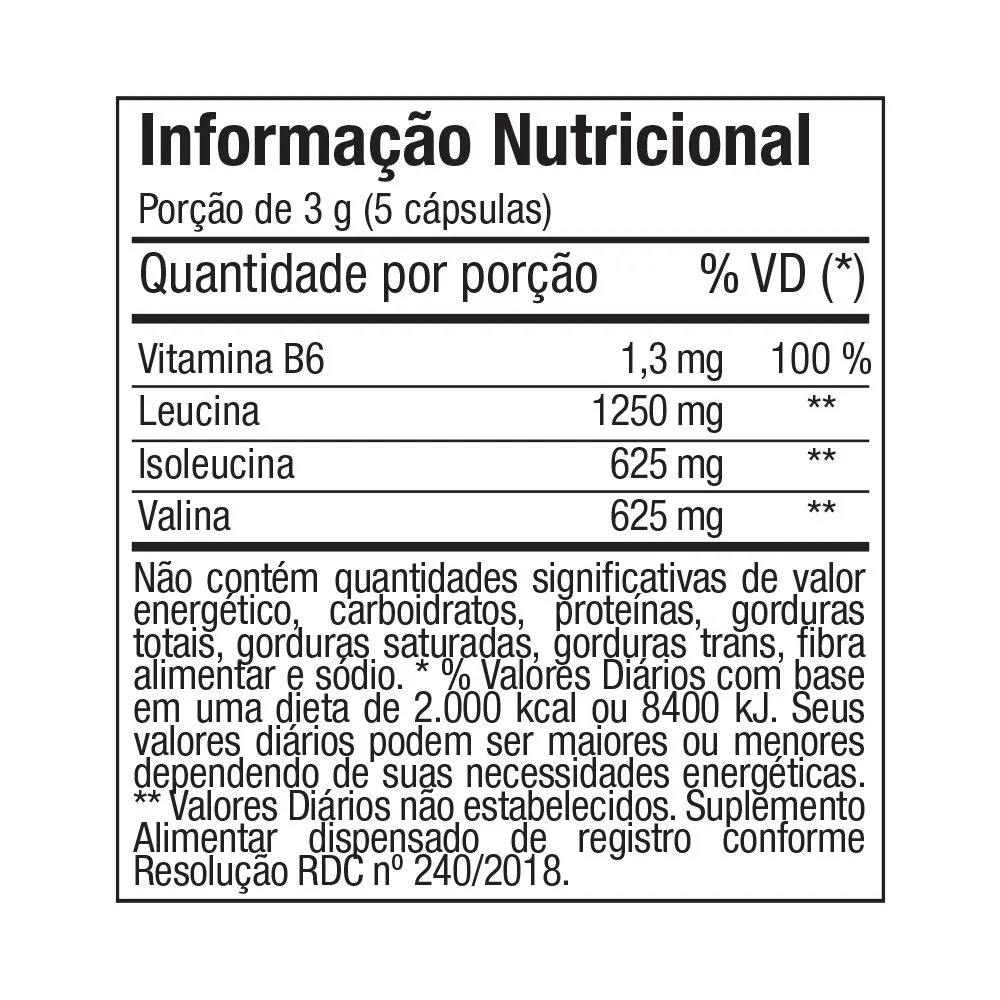 Descrição Completa do Produto BCAA 2500 2:1:1 Aminoácidos de Cadeia Ramificada - FTW O que é / Para que serve BCAA 2500 2:1:1 da FTW é um suplemento alimentar em cápsulas composto pelos aminoácidos essenciais de cadeia ramificada: L-Leucina, L-Isoleucina e L-Valina, combinados na proporção 2:1:1. Esses aminoácidos são obtidos exclusivamente por meio da alimentação ou suplementação e estão presentes em diversas proteínas de origem alimentar. Este produto é indicado para complementar a ingestão diária desses aminoácidos, de acordo com a orientação de nutricionista ou profissional da saúde. Ingredientes BCAA Blend (Leucina, Valina, Isoleucina), cloridrato piridoxina (Vitamina B6), estabilizantes celulose microcristalina e amido, antiumectantes dióxido de silício. Ingredientes da cápsula: Gelatina, corante dióxido de titânio e água potável filtrada. NÃO CONTÉM GLÚTEN. ZERO AÇÚCAR. Apresentação Pote com 100 /200 cápsulas Porção: 5 cápsulas ao dia Como Consumir Ingerir 5 cápsulas ao dia, preferencialmente antes ou após a prática de atividade física, ou conforme orientação de profissional habilitado. Informações Adicionais Produto indicado para maiores de 19 anos; Este produto não deve ser consumido por gestantes, lactantes e crianças; Mantenha fora do alcance de crianças; Não exceder a recomendação diária de consumo indicada na embalagem; Conservar em local seco e fresco, ao abrigo da luz e umidade; Após aberto consumir em até 90 dias; Este produto não é um medicamento. Certificação Suplemento alimentar dispensado de registro conforme Resolução RDC nº 240/2018. Alegações baseadas no Anexo V da IN 28 Anvisa.
