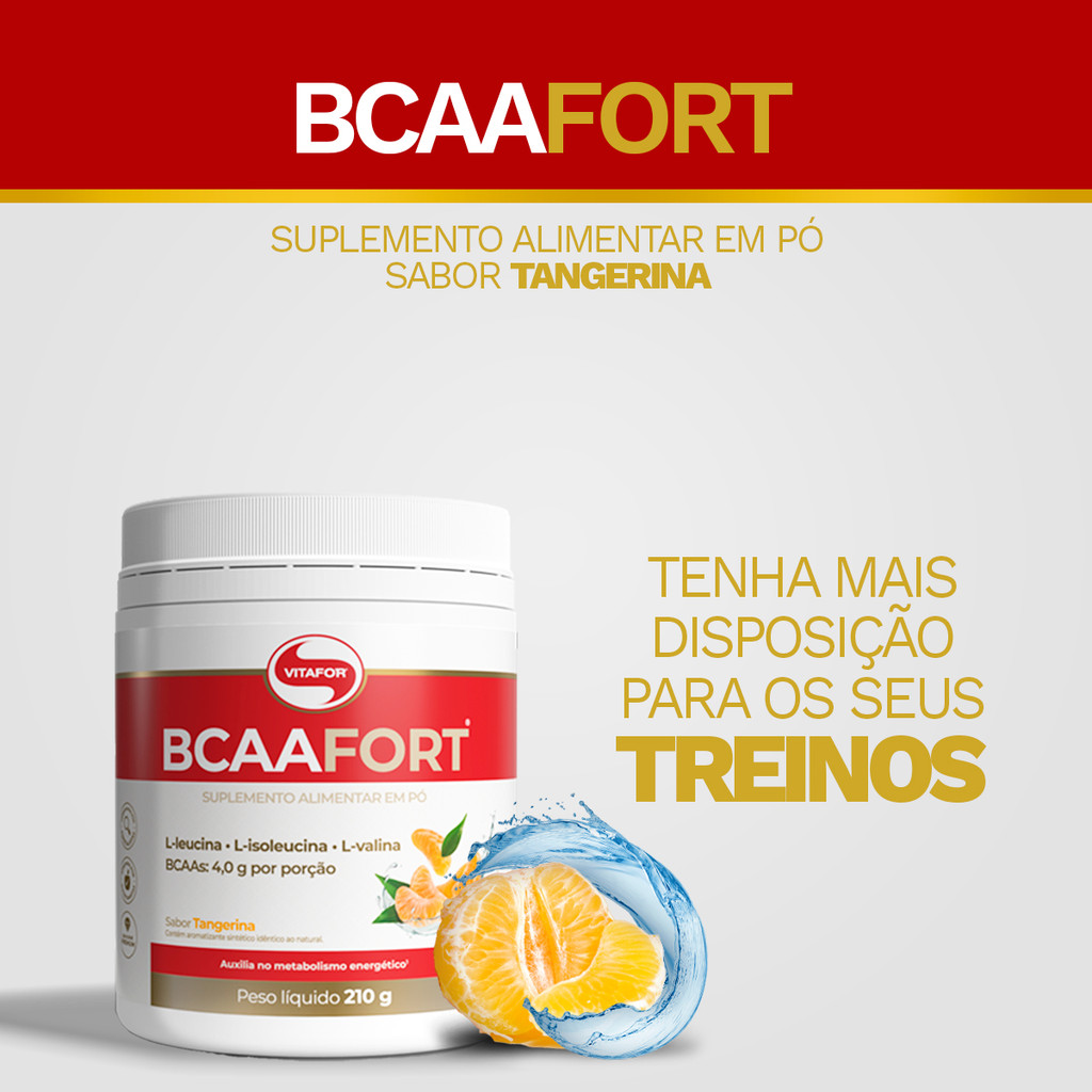 BCAA Fort da Vitafor é um suplemento alimentar composto por aminoácidos essenciais de cadeia ramificada: L-Leucina, L-Isoleucina e L-Valina. Estes aminoácidos são fundamentais para complementar a dieta, especialmente em períodos de maior exigência física. Sua fórmula inclui vitamina B6, nutriente que desempenha um papel importante no metabolismo energético e na função adequada do organismo. Com um sabor agradável de tangerina e livre de glúten, é uma opção prática para a rotina diária de praticantes de atividades físicas. INGREDIENTES L-Leucina, L-Isoleucina, L-Valina, maltodextrina, ácido ascórbico (vitamina C), cloridrato de piridoxina (vitamina B6), acidulante ácido cítrico, aroma idêntico ao natural de tangerina, regulador de acidez fosfato tricálcico, corante natural urucum, antiumectante dióxido de silício e edulcorante sucralose. SUGESTÃO DE USO Ingerir 7g (1 colher medida) ao dia, antes das refeições ou antes e/ou após as atividades físicas, ou conforme orientação de um profissional de saúde. ALÉRGICOS: Não contém glúten.