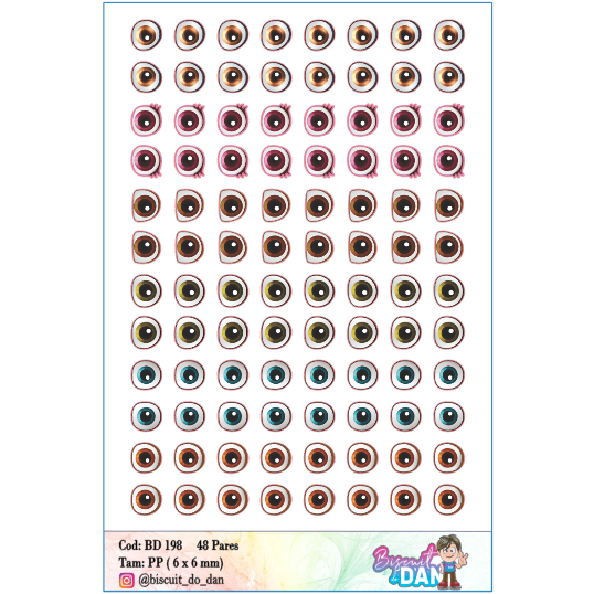 Adesivo resinado de alto brilho Aplicação em biscuit, feltro, madeira e etc. Tamanhos e quantidades PP: 48 pares ( 06 x 06 mm) P: 42 pares ( 7,5 mm) M: 24 pares ( 10 mm )