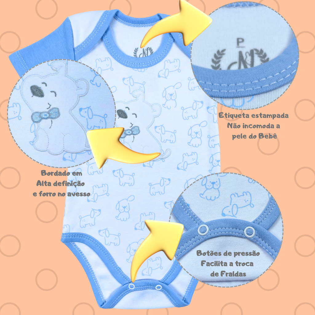 Obrigado pela sua visita, segue algumas caracteristicas do nosso conjunto abaixo: Conjunto de Body Manga curta e Calça com punho. Body com estampa de fundo e bordado com forro e calça com um lindo bordado no bumbum, com o mesmo tema do body. Modelagem grande (premium) para maior aproveitamento da peça, proporcionando mais tempo de uso, e maior economia aos pais! Todas peças sao fabricadas com muito carinho! CONTEM NO KIT: 1 CALÇAS COM BORDADO E PUNHO 1 BODIES MANGA CURTA COM ESTAMPA E BORDADO FORRADO. 📏 Medidas Body: • P: 20 cm largura x 39 cm comprimento x 21 cm manga • M: 21 cm largura x 41 cm comprimento x 24 cm manga • G: 22 cm largura x 44 cm comprimento x 25 cm manga 📏 Medidas Calça: • P: 18 cm largura x 39 cm altura • M: 20 cm largura x 41 cm altura • G: 21 cm largura x 44 cm altura Tamanhos indicados: • P: 3 a 6 meses | M: 6 a 9 meses | G: 9 a 12 meses 🛠️ Cuidados: Lave e passe sempre pelo avesso, evite alvejante e seque na sombra. 📞 Dúvidas? Estamos aqui para ajudar!