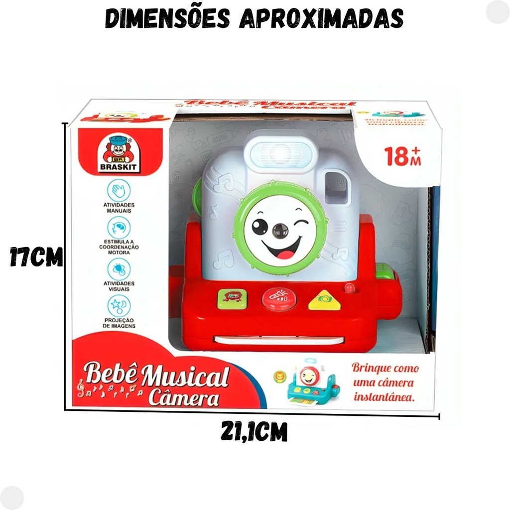 DESCRIÇÃO DO PRODUTO: Com o Bebê Musical Câmera da Braskit, seu pequeno fotógrafo pode "tirar" lindas fotos, prepare-se para fazer pose! Diga X e aproveite esta linda brincadeira imaginativa. Esta incrível câmera de faz de conta possui luz de "flash", botões, anel de focagem giratório, projeção de diversas imagens e cartão de imagem lenticular. Com luz, música e sons realistas de câmera a diversão está garantida Brinque Como Uma Câmera Instantânea. Gire Para Mudar As Imagens Projetadas. Pressione Os Botões Para Emitir Sons de Animais e Musicais e Som de Câmera Fotográfica. Aperte o Botão Na Lateral Para Sair a Foto Lenticular. CARACTERÍSTICAS TÉCNICAS: Conteúdo da Embalagem: 1 Câmera Musical Para Bebes. Dimensões Aproximadas do Produto: 13cm x 14cm x 10,5cm (Altura x Largura x Comprimento/Profundidade) Dimensões Aproximadas da Embalagem: 16,5cm x 11,5cm x 21,1cm (Altura x Largura x Comprimento/Profundidade) Material/Composição: Plástico Idade Mínima Recomendada: A partir de 18 Meses. Participantes: A partir de 1 pessoa. Alimentação: 3 Pilhas 1.5V AAA. Marca: Braskit. Referência: 6308 Outras informações: As cores podem variar entre as imagens mostradas acima e o produto. Imagens meramente ilustrativas. Aviso: As informações e imagens divulgadas são de total responsabilidade do fabricante/fornecedor. Produto lacrado e disponível a pronta entrega para todo Brasil! APROVADO PELO INMETRO