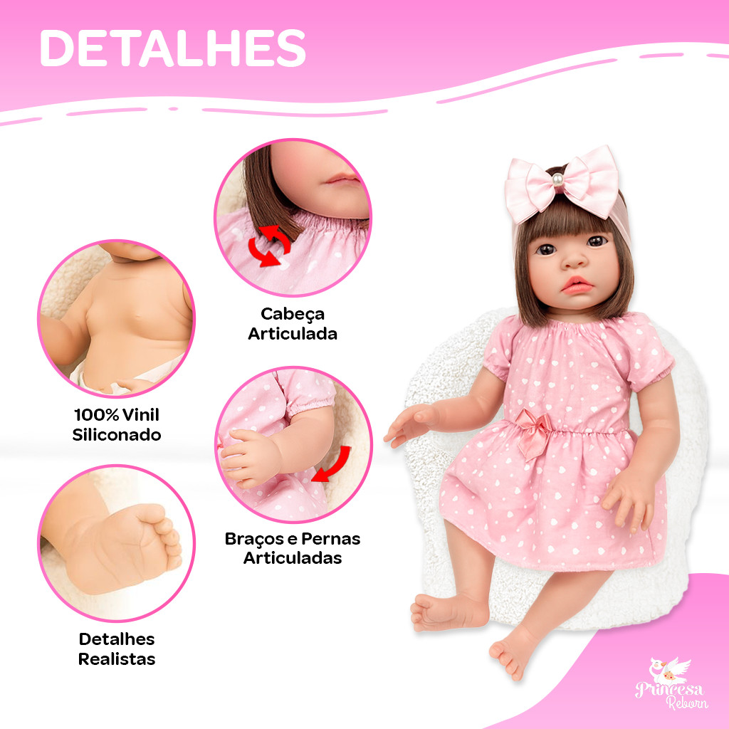 👶✨ Bebê Reborn Menina – Princesa Reborn ✨👶 Sua criança merece o melhor do mundo Reborn! Encante-se com a delicadeza, o carinho e a qualidade que só a Princesa Reborn oferece. 💖 Características do Bebê Reborn: Molde nacional com 44 cm Peso aproximado: 800g Produzida em 100% vinil siliconado – toque macio e super realista! ______________________________________________________ 🎁 NOSSA BEBÊ REBORN ACOMPANHA O KIT: ✅ 1 Vestido super fofo ✅ 1 Lacinho delicado ✅ 1 Livro Interativo contendo: • Teste do Pezinho • Certificado de Autenticidade • Carteirinha de Vacinação • Primeiros Ultrassons • Certidão de Nascimento • Manual de Cuidados • História Infantil • Jogo dos 7 Erros • Encontre o Caminho • Complete a Letra • Jogo das Cores ✅ 1 Mamadeira ✅ 1 Chupeta ✅ 2 Fraldas descartáveis ✅ 1 Bolsinha linda ______________________________________________________ 🌟 São diversos itens incríveis para tornar a brincadeira ainda mais especial, educativa e realista! 🔔 Atenção: Todos os itens que não estão listados acima são meramente ilustrativos. 💝 Não perca essa oportunidade de encantar sua criança com a Princesa Reborn! Garanta já a sua! Porque quem ama, escolhe o melhor. 💕