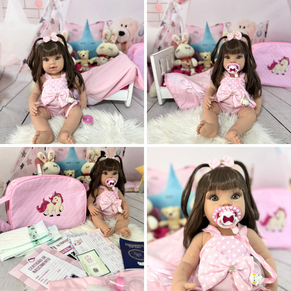 Descubra a magia das nossas bonecas realistas, criadas para encantar em cada detalhe! Ideal para crianças, colecionadores, presentes especiais ou momentos de diversão e carinho! Destaques do Produto: Pode tomar banho! Corpo 100% siliconado, macio e articulado, com genitália. Detalhes encantadores: Cílios realistas, cabelinho castanho e olhos castanhos. Movimentos naturais: A bebê pode ser colocada sentada graças ao seu corpo articulado. Especificações: Tamanho: Aproximadamente 48 cm (veste roupinhas tamanho RN). Peso: Cerca de 1,0 kg. Itens Inclusos: Modelo 1 01 Boneca reborn siliconada; 01 Bolsa maternidade de alta qualidade; 01 Mantinha; 01 Jardineira super delicada com estampa de poá; 01 Lacinho; 01 Chupeta magnética toda decorada; 01 Prendedor de chupeta; 01 Certidão de nascimento; 01 Carteirinha de vacinação; 01 Identidade; 01 Passaporte; 01 Ultrassom da bebê; 01 Mamadeira; 01 Pente decorado 01 Escova decorada; 03 Fraldas descartáveis; 01 Pulseira; 01 Caixa Personalizada da nossa loja. Modelo 2 01 Boneca reborn siliconada; 01 Jardineira super delicada com estampa de poá; 01 Lacinho; 01 Chupeta magnética toda decorada; 01 Caixa personalizada da nossa loja. Perguntas Frequentes: Pode dar banho? Sim! O corpinho siliconado. Qual o tamanho e peso? Mede 48 cm e pesa cerca de 1 kg. É pronta entrega? Sim, temos pronta entrega! Qual o tamanho da roupinha? Tamanho RN ou prematuro. Uma bebê que combina encanto, realismo e diversão. Adote agora e aproveite uma experiência única!