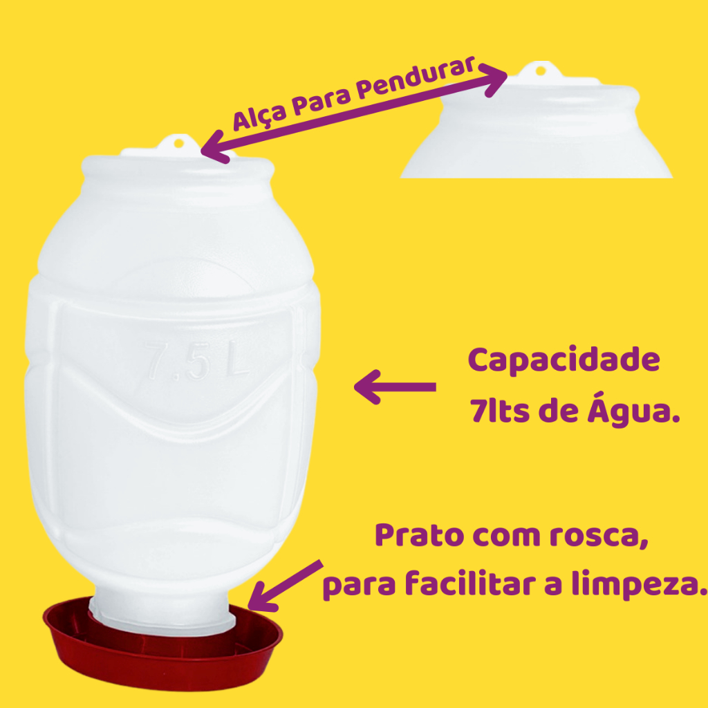 Bebedouro Transparente de 7,5L Capacidade: 7,5 litros, garantindo água fresca para um grande número de aves por mais tempo. Higiene: A alça evita que as aves entrem na água, mantendo-a limpa e livre de contaminação. Prático: O sistema de funcionamento é simples: basta encher e virar. Resistente: O plástico duro garante durabilidade e evita vazamentos. Dicas para melhor utilização: Limpeza: Lave os recipientes com água e sabão neutro regularmente para prevenir a proliferação de bactérias e garantir a saúde das aves. Localização: Posicione o kit em um local seco e protegido do sol direto, evitando a proliferação de algas na água.