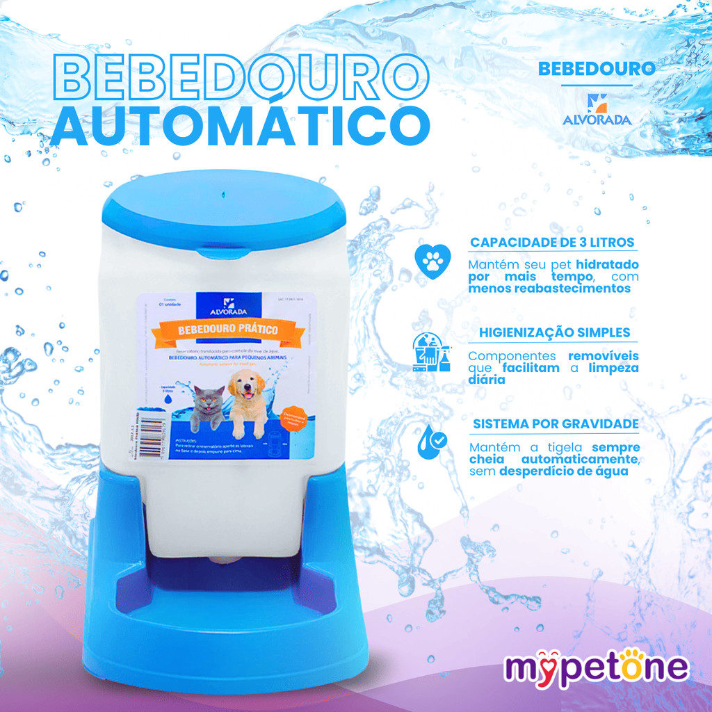 Bebedouro Prático Alvorada Pet 3 Litros Garanta água fresca e disponível por muito mais tempo com o Bebedouro Prático Alvorada pet 3 Litros. Ideal para cães e gatos de todos os portes, ele oferece praticidade, economia e bem-estar para o seu pet — mesmo nos dias mais quentes ou quando você estiver fora por algumas horas. Fabricado com materiais resistentes e duráveis, o Bebedouro Alvorada possui sistema de abastecimento por gravidade, garantindo fluxo contínuo de água, sempre que o pet precisar. Por que escolher o Bebedouro Alvorada Pet 3 Litros: - Capacidade de 3 Litros: Ideal para manter seu pet hidratado por muito mais tempo, com menos necessidade de reabastecimento - Sistema por Gravidade: Mantém a tigela sempre abastecida automaticamente, sem desperdício - Base Estável e Segura: Evita tombamentos, mesmo com pets agitados - Fácil de Higienizar: Componentes removíveis que facilitam a limpeza diária- Transparente e Funcional: Permite acompanhar o nível da água com facilidade Especificações Técnicas: - Capacidade: 3 Litros - Cores: Preto, Azul, Vermelho. Rosa Dimensões Aproximadas: - Altura: 22,5 cm - Base: 27 cm Material: - Reservatório em plástico translúcido de alta resistência - Base em polipropileno atóxico e livre de BPA Com o Bebedouro Prático Alvorada pet 3L, seu pet se mantém sempre hidratado com muito mais autonomia e praticidade para você. Uma escolha inteligente para o dia a dia!