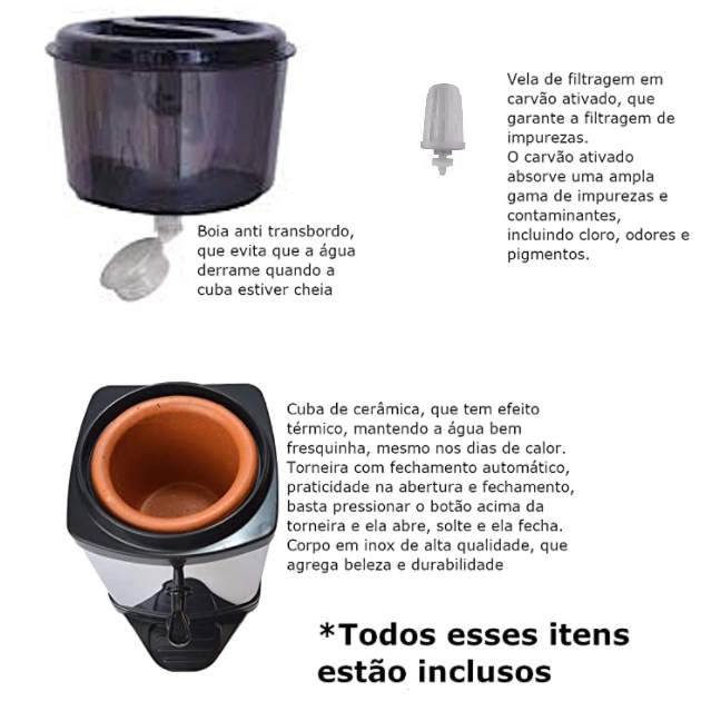 ***ITENS INCLUSOS*** 1 (um) filtro Agua Purificador Inox Preto C/ Vela E Bóia, TORNEIRA PRETA Diâmetro interno da torneira 7/16'' - Diâmetro da rosca externa 5/8'' * ACOMPANHA RECIPIENTE PARA ADICIONAR ÁGUA (abastecimento manual) Descrição -Durabilidade e qualidade comprovadas; -Água naturalmente sempre fresca e saudável; -Equipado com Torneira Click e boia dosadora evitando o transbordamento; -Equipado com vela que possui parede filtrante, reduz impurezas presentes na água, retendo partículas sólidas e impurezas, e reduz o cloro e odores e sabores presentes na água. A micro porosidade do feltro retém partículas enquanto o carvão ativado deixa a sua água totalmente livre de cloro; - A Vazão de água deste produto é lenta nos primeiros dias e tende a aumentar quando o CARVÃO ATIVADO ficar totalmente umedecido. Substitua a vela filtrante a cada 6 meses de uso ou 500 litros de água, o que ocorrer primeiro. Obs.: pode ser substituída por qualquer modelo universal de plástico ou cerâmica. - Para a limpeza da vela utilize um jato de água. CAPACIDADE DE ARMAZENAR: Capacidade total 6,5 L ( água reservatório superior + cuba cerâmica) DIMENSÕES: Comprimento: 28 cm Largura: 24 cm Altura: 42 cm Peso: 3 kg COMPONENTES: 1 vela 1 boia de nível - livre BPA 1 torneiras 1 cuba de barro Cores: Inox/Preto Perguntas frequentes: -Torneira: Em caso de : *Vazamento - Solicitamos que realize o aperto manual, - Utilização de veda rosca, * Bóia Caso essa não esteja fazendo sua função, solicitamos a gentileza de: fazer o movimento de abrir e fechar a boia, com a mão subir e descer a parte móvel, pois pode ter algum resíduo de plástico na borda e assim com o movimento esse resíduo sai e a função da boia volte. * Nossos filtros tem um espaçamento na parte da cuba, devido seu material suar, essa condição é normal desde que não haja vazamento. * QUANDO O FILTRO COMEÇA A SER UTILIZADO A VELA FICA COM UMA COR ESCURA PELO FATO QUE ESTÁ FILTRANDO AS IMPUREZAS DA ÁGUA; * A CUBA CERÂMICA PASSA POR UM PROCESSO DE IMPERMEABILIZAÇÃO, POR ESSE MOTIVO TEM UM BRILHO E PODE TER UM "GOSTO" NA ÁGUA DURANTE ATÉ 2 MESES, DEVIDO AO PROCESSO DE IMPERMEABILIZAÇÃO. * BASE SUPORTA GALÃO DE 20 LITROS, no caso de usar o galão de 20 litros, este deverá ser de água potável, pois não estará tendo a função de filtragem. * SUPORTE DO COPO É FIXO. * A TORNEIRA É FIXADA NA BASE DE BARRO, SENDO ASSIM NÃO É POSSÍVEL UTILIZAR O MESMO SEM A CUBA.